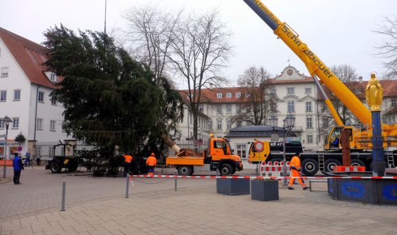 Bad Wurzach - Die große Fichte, die in diesem Jahr als großer Christbaum in der Stadtmitte steht, stammt wie im Vorjahr von einem städtischen Grundstück: rund 45 Jahre lang „bewachte“ sie die Zufahrt zum alten Hallenbad, war dort kurz nach dessen Fertigstellung gepflanzt worden. (Mit Bildergalerie)