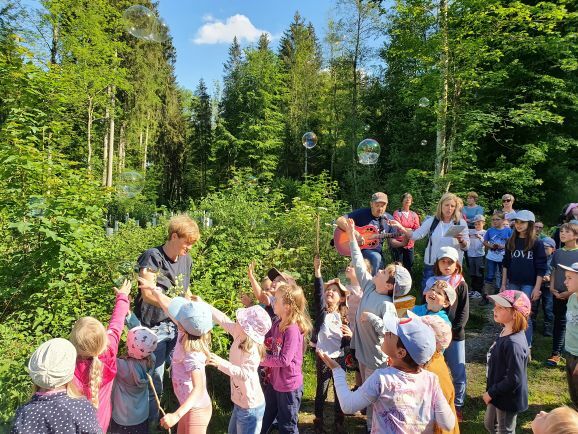 Startpunkt war die alte Nudelfabrik in Bolanden. Von dort aus machten sich ca. 60 große und kleine Teilnehmer mit Leiterwagen und Gitarre auf den Weg. Alle Gottesdienstbesucher waren von Anfang an miteinbezogen und die Elemente Erde, Wasser, Luft und Feuer wurden für Kinder und Erwachsene erfahrbar gemacht. So galt es zum Beispiel Schätze des Waldes zu suchen, die Füße in der Wolfegger Ach zu erfrischen, Blütenblätter ins Wasser zu streuen und Seifenblasen in die Luft zu blasen.