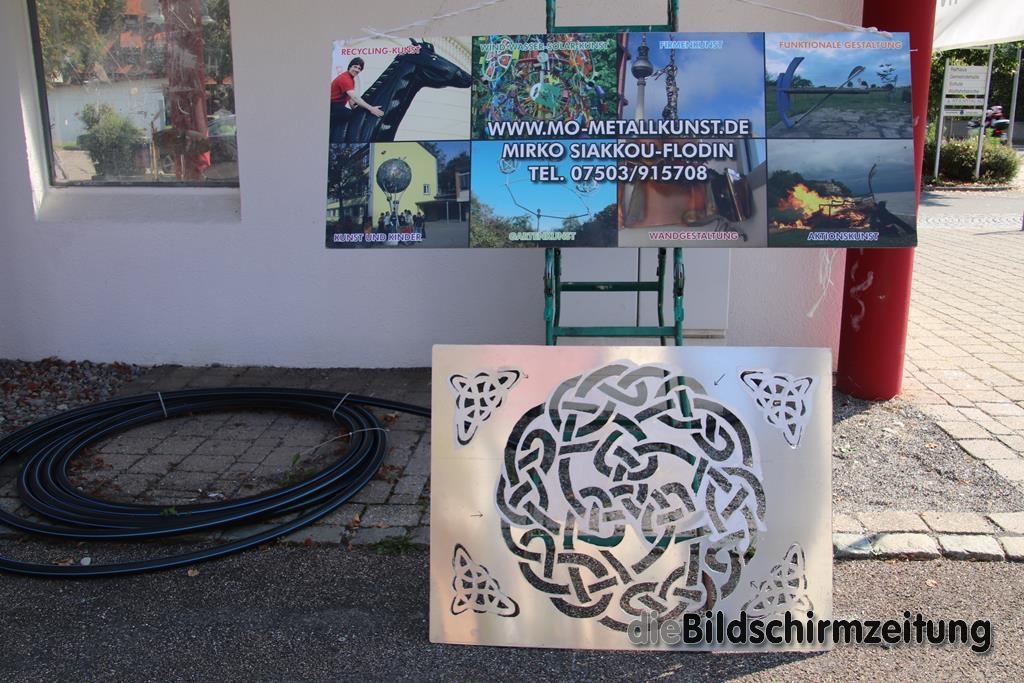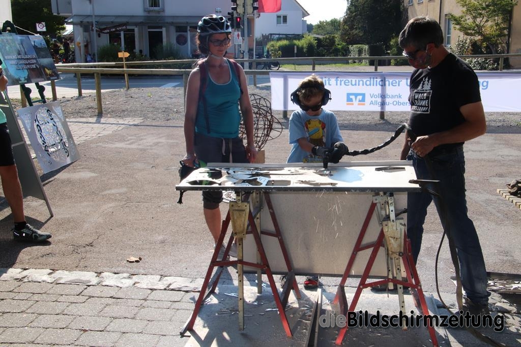 Bergatreute - Am Aktionspunkt der Bürgerstiftung Bergatreute war wie am Wochenende zuvor Mirko Siakkou-Flodin aus Zußdorf anwesend, der wieder seine sehenswerte Metallkunst präsentierte und die vorbeikommenden Radler zum Plasmaschneiden ausgedachter Motive einlud.