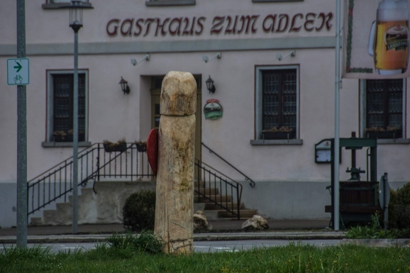 Bergatreute - Anstatt eines Maibaumes ist seit heute mitten im Ort Bergatreute ein Holzpenis zu bestaunen. Was Corona nicht alles ändert und bewirkt..
