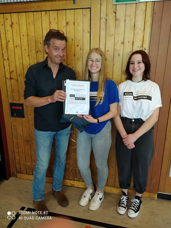 Danach folgte die Siegelübergabe der Landeskoordination für Schule ohne Rassismus in Person von Andreas Haiß an die beiden Schülerinnen und Mitinitiatoren Jamie-Lee Beckemeyer und Emma Brauchle.