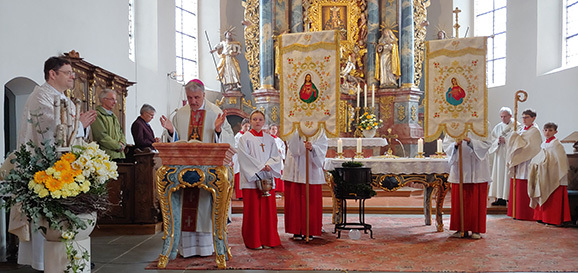 Bergatreute - Bei typischem Aprilwetter konnte am 23. April der außerordentliche Festtag zur Muttergottes von Re in der Wallfahrtskirche Bergatreute gefeiert werden: noch regnerisch am frühen Morgen und pünktlich zur Zusammenkunft an der Theke am Ort mit purem Sonnenschein.