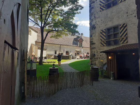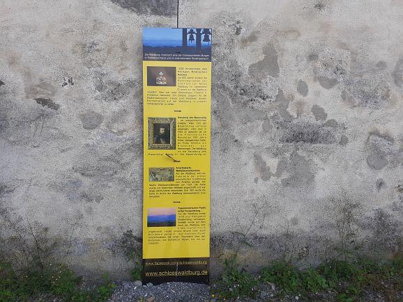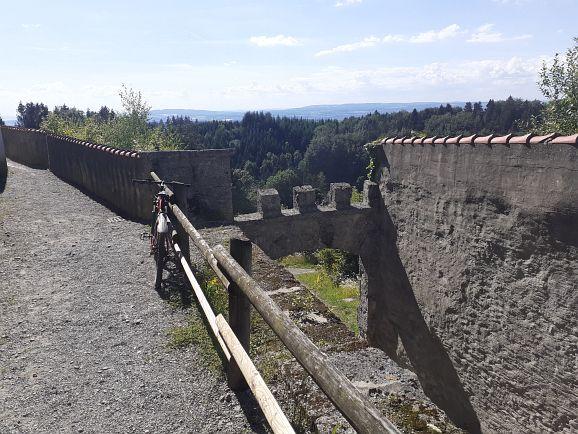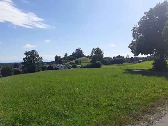Und wir übten nicht nur das Fahren auf dem Rad, sondern auch mit dem Rad stehen zu bleiben und gleichzeitig Finger von Daniel zu zählen. Dann ging es auf einem schmalen Pfad dem Bach entlang zum Rößler Weiher und über Wetzisreute und Greut zur Waldburg. Von der 772 m hohen Burg hat man einen Blick zum Bodensee, den Schweizer Alpen und die Vorarlberger Berge bis hinüber zur Nagelfluhkette im Allgäu.