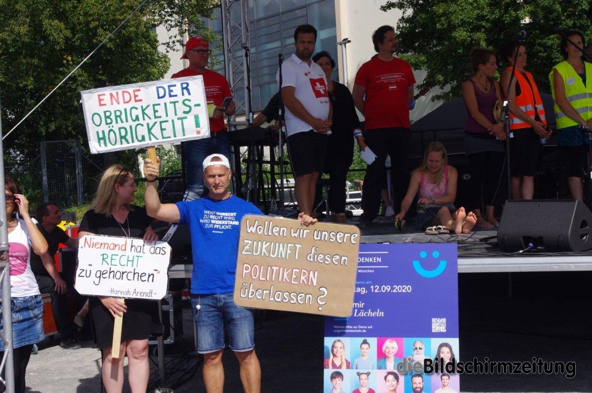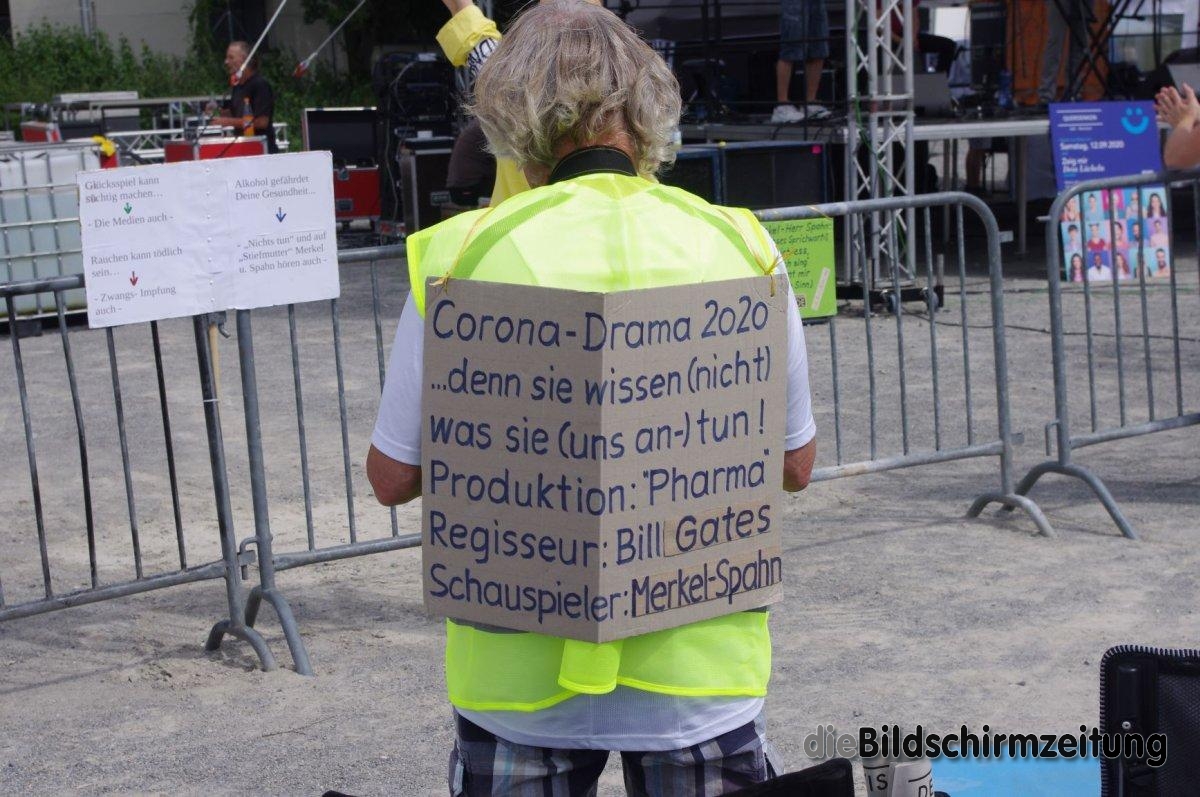 Ein Auszug aus den Wortbeiträgen eines Vorredners von Ballweg, Neos, der sich schon lange Gedanken über Gott und den Glauben macht, aus drei Minuten Redezeit 30 Minuten macht und erst ganz zum Schluss bei einem Argument endet, das etwas zum Thema Virus beiträgt, indem er feststellt, Mutter Teresa hätte bei ihrer Arbeit keine Angst vor dem Virus gehabt. Da sind die Transparente, die gegen „Impfschutz“ oder „Obrigkeitshörigkeit“ gezeigt werden schon konkreter und ganz konkret ist eine vielfach am Eingang verteilte Zeitung „Demokratischer Widerstand Nr. 13“ die in einer dicken Titelschlagzeile fordert „Masken Ab!“