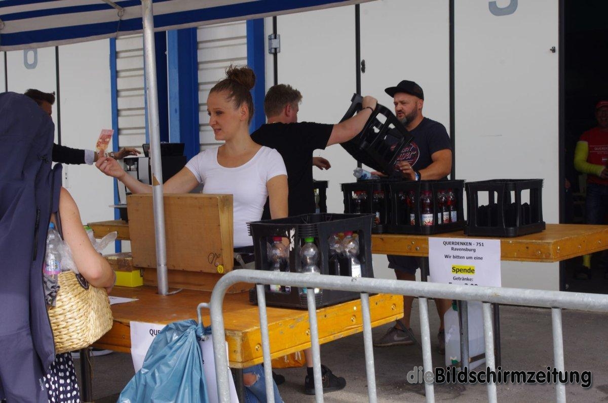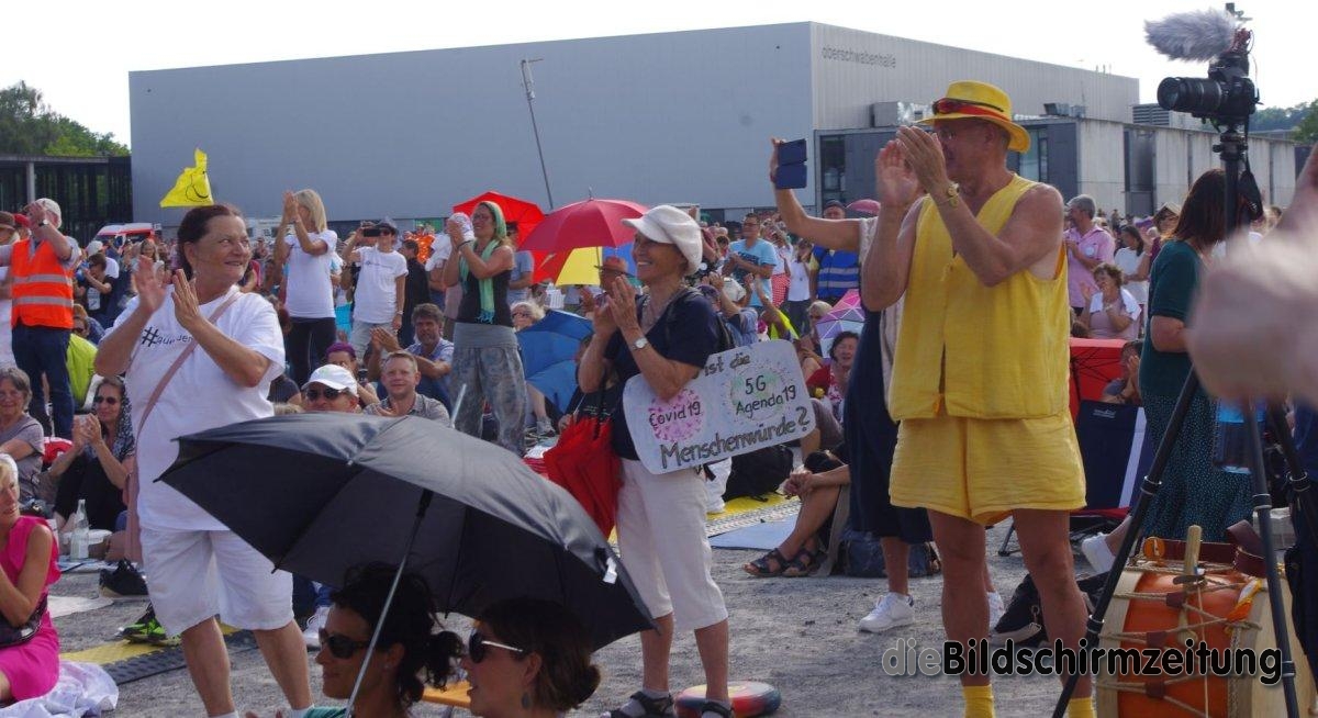 Unter den Teilnehmern hatte auch am gestrigen Sonntag (26.07.20) schon niemand eine Maske auf und nur in den ersten Reihen wurde noch leidlich der Mindestabstand von 1,50 Metern eingehalten. Die Polizei, die entfernt im Schatten Stellung bezogen hatte, schritt nicht ein und hoffte wohl, dass sich die Veranstaltung von 14 bis 22 Uhr angekündigt, mit der Zeit verlaufen würde. Was auch geschah, als nach Ende von Ballwegs Rede um 17.30 Uhr größere Scharen den Platz verließen. Zuvor waren einige der Teilnehmer von 11 bis 13.30 Uhr schon dem Ruf der Trommeln von Weingarten nach Ravensburg gefolgt.