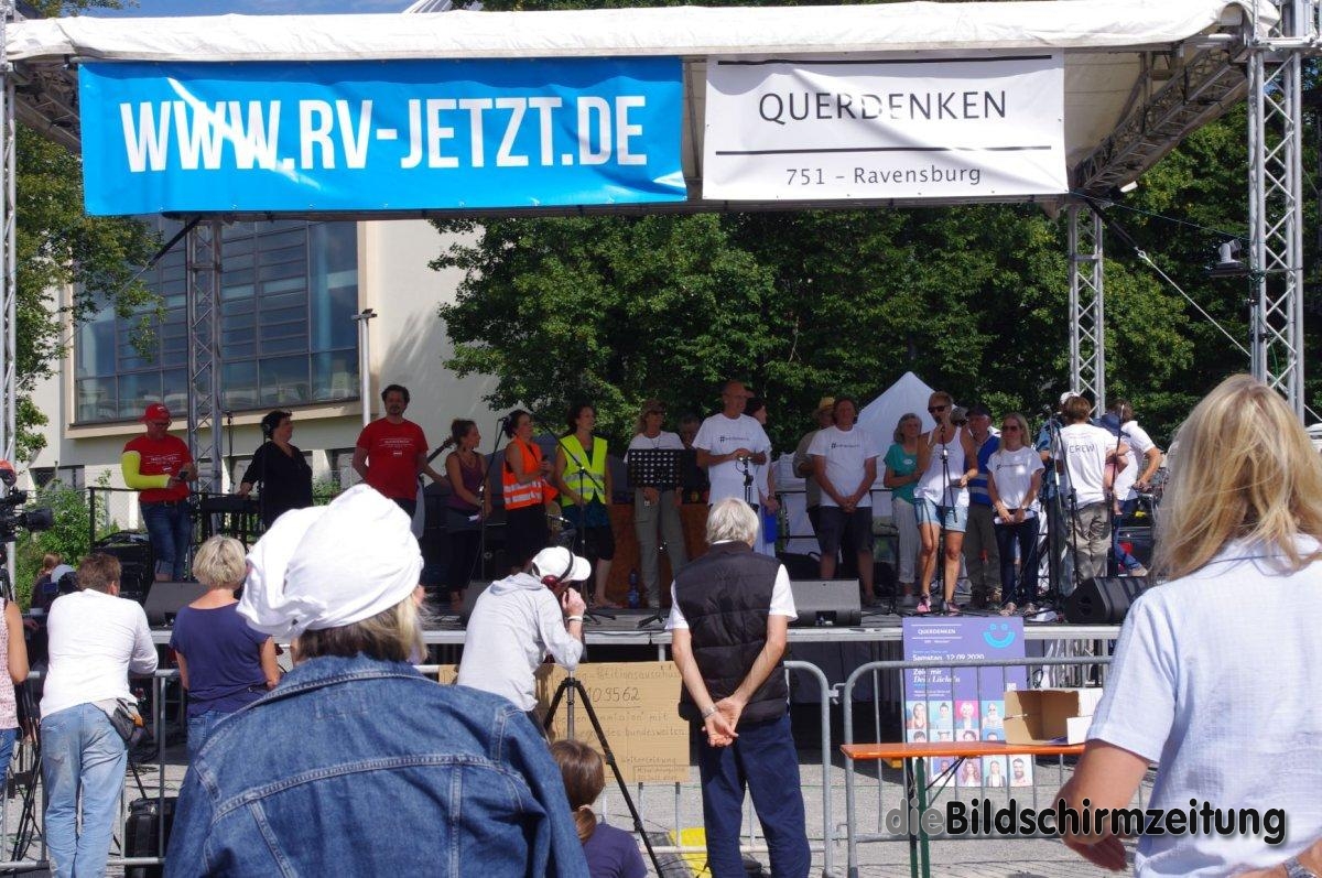 Ravensburg – Mit mehr als einer Stunde Verspätung zum angekündigten Programmablauf kam der Auftritt von Michael Ballweg, einem Kandidaten für die Stuttgarter OB-Wahl, bei der gestrigen Demonstration in Ravensburg mit seiner wichtigsten Botschaft zustande, er habe eine Großdemonstration für die Verfassung am 1. August in Berlin angemeldet. Hoffentlich weiß er dann noch, wo er gerade ist, hatte er doch gleich zum Beginn seiner Rede die Ravensburger mit Freiburger angesprochen.