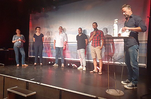 Der Moderator Uli Boettcher erklärte zuerst, dass alle Teilnehmer, 16 Schüler-Teams und 21 Erwachsenen-Teams mit zusammen 336 Pedalisten über 115.000 Kilometer geradelt sind. Das entspricht einer CO2 Ersparnis von 20,7 Tonnen und dies wiederum einem Würfel von 100 mal 100 Metern. Dann hieß es für die Teams aufzustehen, wenn sie aufgerufen wurden und besonders viel Beifall erhielten die Siegerteams vom Bildungszentrum Bodnegg mit über 8000 km bei den Jugendlichen und vom DAV Bad Waldsee mit über 11000 km bei den Erwachsenen. 51785 Kilometer der Erwachsenenteams entsprechen 5178 Euro für 9 Kultureinrichtungen und die Bürgerstiftung Ravensburg.