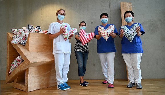 Die herzförmigen Kissen werden neben den an Brustkrebs erkrankten Patienten auch an schwerkranke Menschen in der Palliativstation verschenkt. „Die Momente, in denen wir den kranken Patienten das Herzkissen übergeben, sind unvergesslich“, erzählt Beate Metzler, Fachfrau für komplementäre Pflege im Onkologischen Zentrum am EK. Die Freude über den kleinen Seelentröster mit der persönlichen Nachricht sei jedes Mal sehr groß und für viele Patienten werden die weichen Herzen zu täglichen Begleitern.