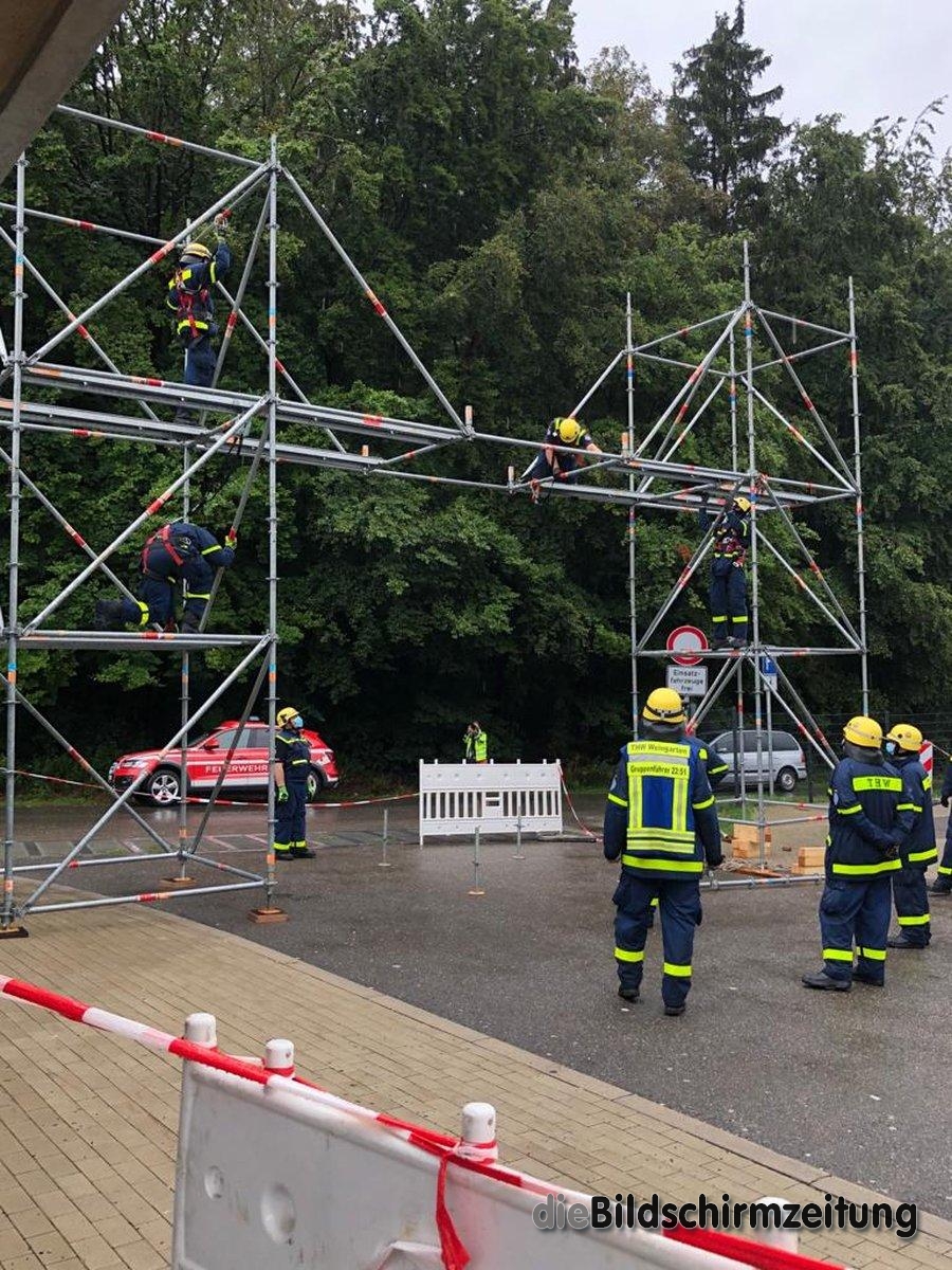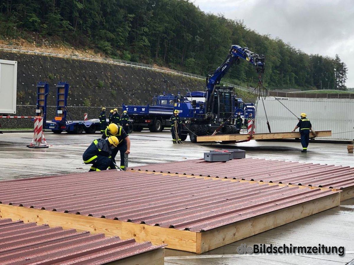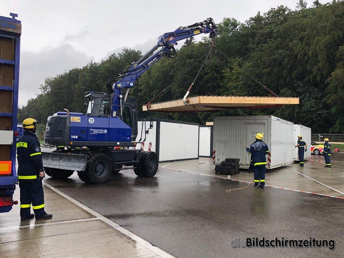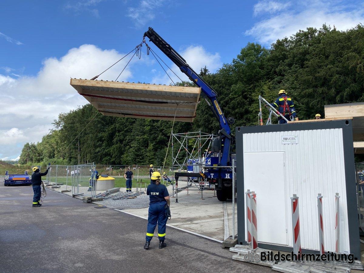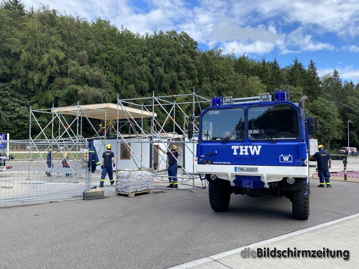 Bereits am Samstagmorgen gegen 5:30 Uhr begannen die ersten Einheiten vor Ort am Parkplatz Kemmental-Ost mit den Aufbauarbeiten. Die erweitere Führungsstelle bestehend aus den THW Ortsverbänden Blaubeuren und Wangen koordinierte sämtliche Einheiten, welche in sechs Einsatzabschnitten organisiert waren. Der größte Einsatzabschnitt war der Aufbau der Corona Testbahn für PKWs sowie Wohnmobile. Dort wurden sechs 20 Fuß Container mit selbst gebauten Überdachungen aufgebaut. Die Überdachungen wurden mit Hilfe von Ladekran und Radbagger auf die Dächer der sechs 20 Fuß Container gelegt und dort miteinander fest verbunden. Für Wohnmobile wurde mit einem Einsatzgerüstsystem (EGS) eine erhöhte Testbahn eingerichtet. Für den Bau der Überdachungen wurden 250 laufende Meter Holz sowie 200qm Trapezblech verarbeitet.