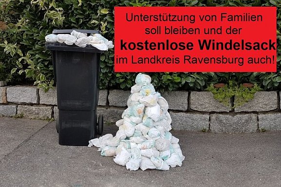 Ravensburg - Der Kreistag des Landkreises Ravensburg hat in der Sitzung am 09.07.2020 beschlossen, dass der kostenlose Windelsack für Familien mit Kindern bis drei Jahren und für inkontinente Bürgerinnen und Bürger des Landkreises zum 01.01.2021 abgeschafft wird. Gegen diese Entscheidung formiert sich im ganzen Landkreis Ravensburg nun Widerstand und so haben bereits mehr als 2.300 Personen die Petition „Unterstützung von Familien soll bleiben und der kostenlose Windelsack im Landkreis Ravensburg auch!“ unterschrieben.
