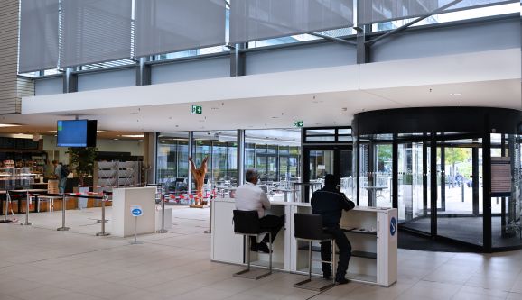 Erster Anlaufpunkt für Besucher ist die Security-Theke direkt hinter der Drehtür des Haupteingangs. Hier wird zunächst kontaktlos die Körpertemperatur gemessen. Besteht keine Fiebererkrankung, dürfen sich die Besucher in den Wartebereich auf der rechten Seite begeben, wo die Besuchererklärungen einzeln überprüft werden. Um die Wartezeit zu verkürzen, können Besucher das Formular bereits vor dem Besuch ausfüllen und mitbringen. Das Besucherformular steht zum Download auf der Homepage der Oberschwabenklinik bereit.