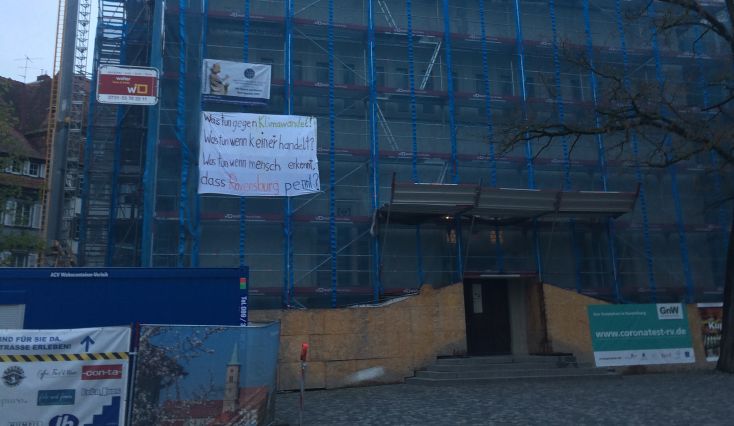 Ravensburg - Als Reaktion auf ein verstrichenes Ultimatum eröffneten Ravensburgs Klimacamper*innen nun intensive Klimaaktionswochen in Ravensburg. Am heutigen Montag machten sie mit einem in aller Frühe am Ravensburger Rathaus angebrachten Banner den Auftakt: "Was tun gegen Klimawandel! Was tun wenn keiner handelt? Was tun wenn mensch erkennt, dass Ravensburg pennt?"