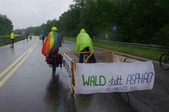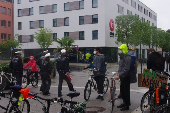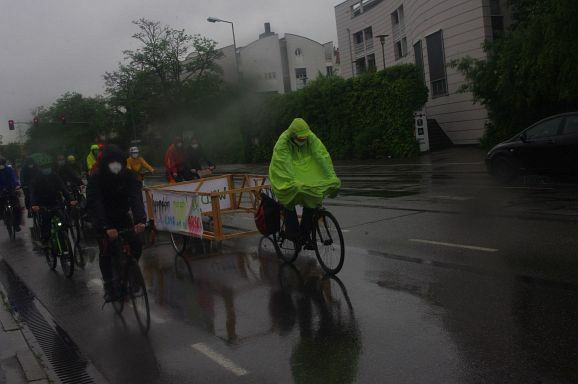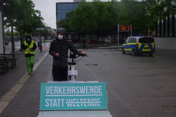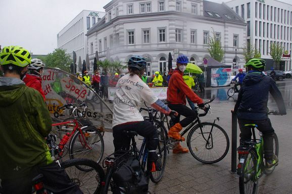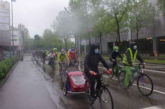 Schon aus Gründen der Familientauglichkeit war ein Tempo von zehn kmh angesagt und entsprechend dauerte die Fahrt gut eine Stunde. Vereinzelt wurden Parolen, wie Wiesen und Wald statt Asphalt gerufen, aber diese wurden durch die geschlossenen Fenster nicht gehört. Eher schon kündigte die Musikbox die Veranstaltung an und lockte einige Zuschauer:innen an den Straßenrand. Meistens winkten diese freundlich, beklatschen die Fahrradfahrer oder feuerten sie an. Aggressive Reaktionen gab es keine. Etwa 13.30 Uhr war man zuletzt über die Gartenstraße zum Frauentor und den Marienplatz zurück am Bahnhof, wo sich eine Kundgebung anschloss.