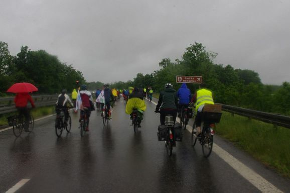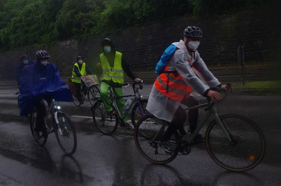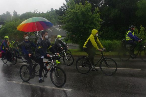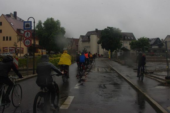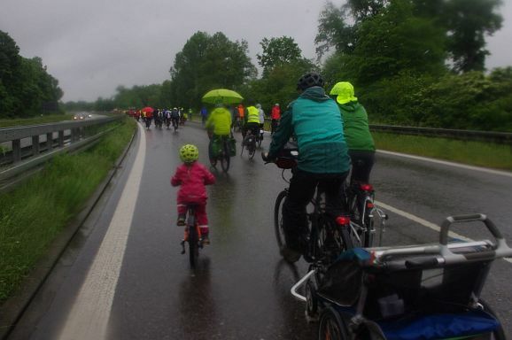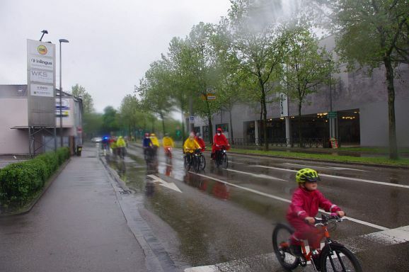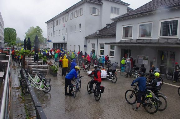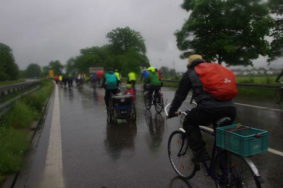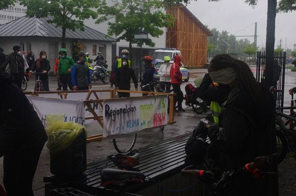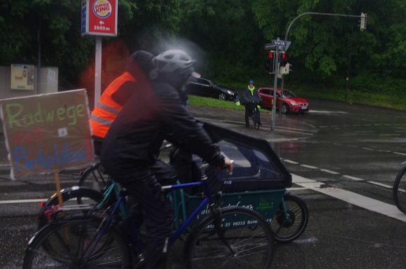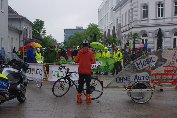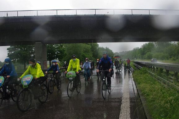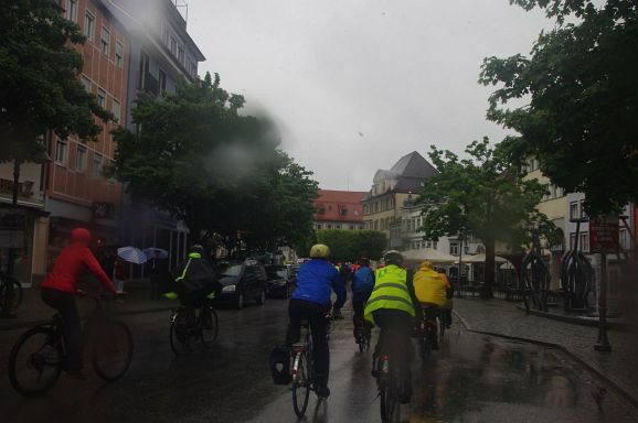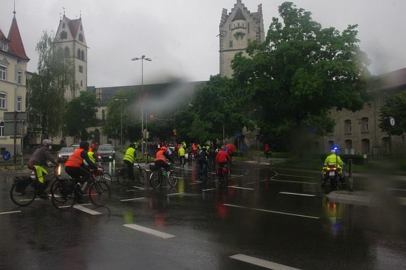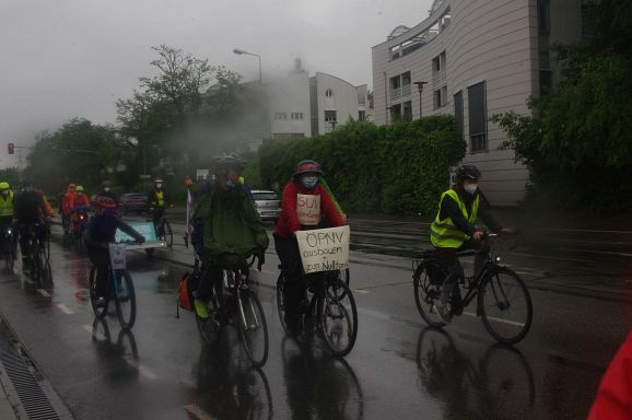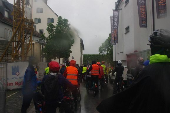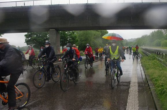 Schon Stunden vor Beginn um 12 Uhr und den ganzen Nachmittag regnete es ohne Pause, mal weniger, mal mehr. So war zu erwarten, dass nicht alle der 300 angekündigten Teilnehmer:innen den Weg zum Bahnhof fanden. Trotzdem, als die Fahrraddemo eskortiert von Polizei um 12 Uhr 10 losfuhr, war es ein beachtlicher Zug von gut 200 Teilnehmer;innen, der sich 500 Meter lang auffädelte. Über die vierspurige Ulmer Straße ging es die etwa 10 km lange Strecke nach Weingarten und wieder zurück nach Ravensburg.