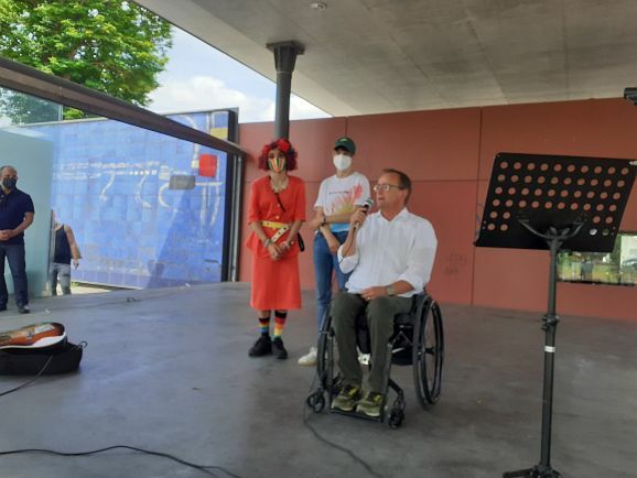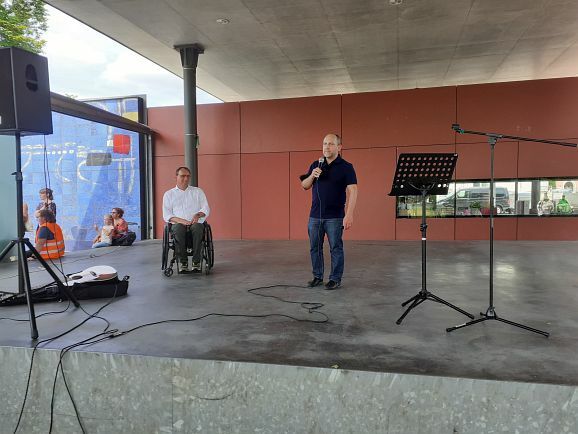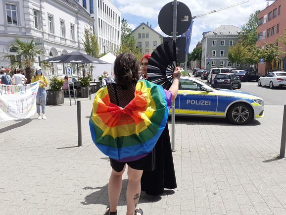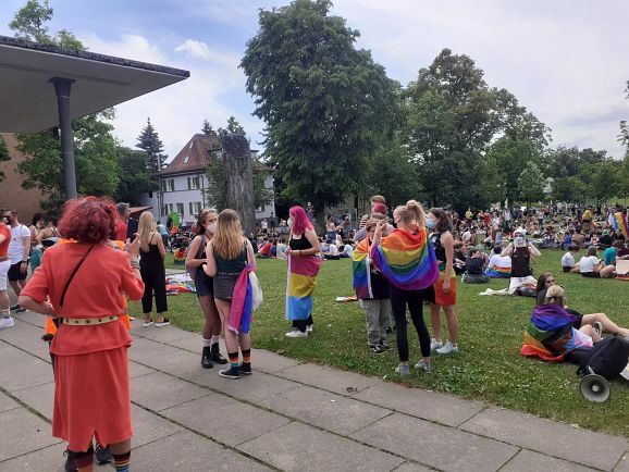 Zuerst sprach der Oberbürgermeister von Weingarten Markus Ewald ein Grußwort, kritisierte die aktuelle Homophobie in Ungarn und an anderen Orten. Ihm folgte sein Bürgermeisterkollege aus Ravensburg Simon Blümcke mit einer Begrüßung der Teilnehmer*innen, bevor die Vorsitzende von Netzwerk LSBTTIQ Baden-Württemberg Janka Kluge, die für Akzeptanz und gleiche Rechte eintritt und extra aus Stuttgart angereist war, beklagte, dass nächstes Jahr im SGB noch nicht geregelt sei, die gesundheitliche Versorgung bei der Umwandlung für Männer und Frauen in jeder Richtung.