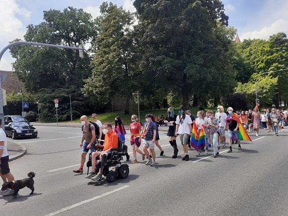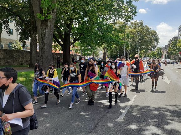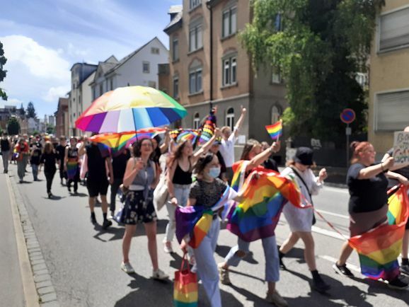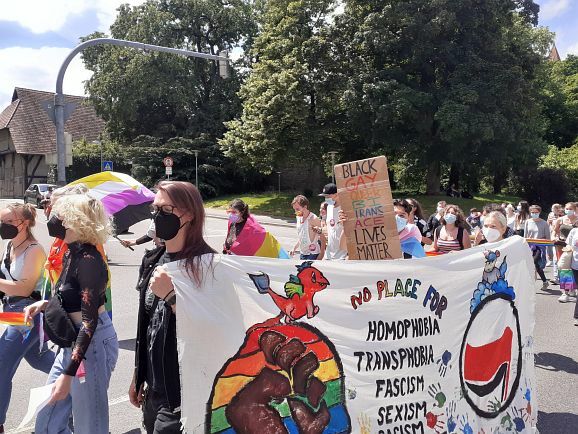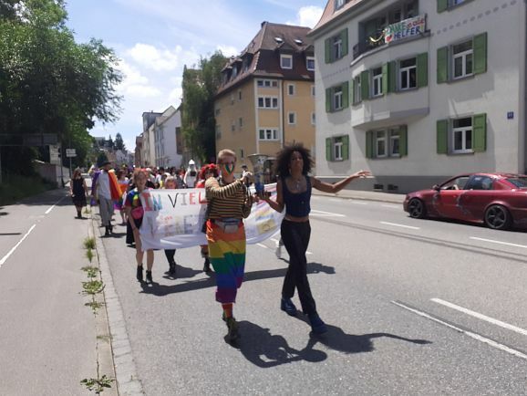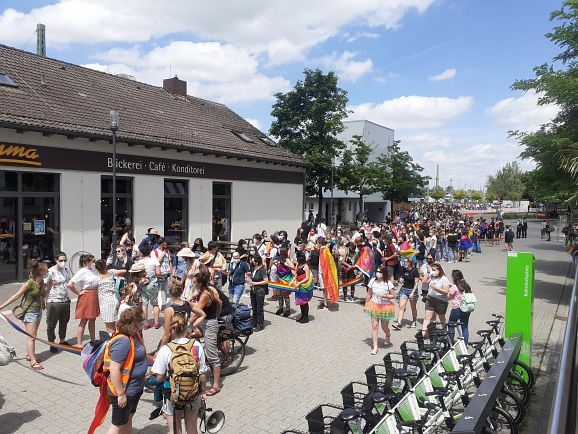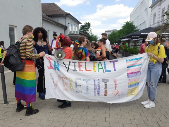 Ravensburg/Weingarten – Es dauerte, bis die vielen vorwiegend jungen Teilnehmer*innen am Bahnhof in Ravensburg in 10er-Gruppen aufgeteilt waren und losmarschieren konnten. „Vielfalt vereint“als Transparent an der Spitze und die Regenbogenfahnen in allen Variationen um den Körper gewickelt, auf die Kleidung gepappt oder den Hund beflaggt.