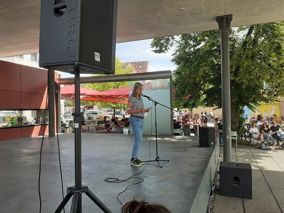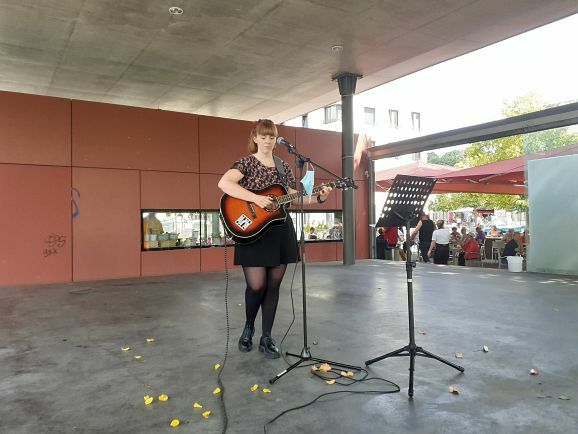 Dann kam der gesangliche Vortrag von Weingartens bester Sängerin Franziska Groß zur Geltung, die unter ihren ersten drei Liedern auch einen Song präsentierte, den sie erst zum zweiten Mal öffentlich sang und der das Thema Vielfalt mit der Textzeile „Alle reden von Vielfalt,..,“ behandelt, aber noch keinen Titel hat.