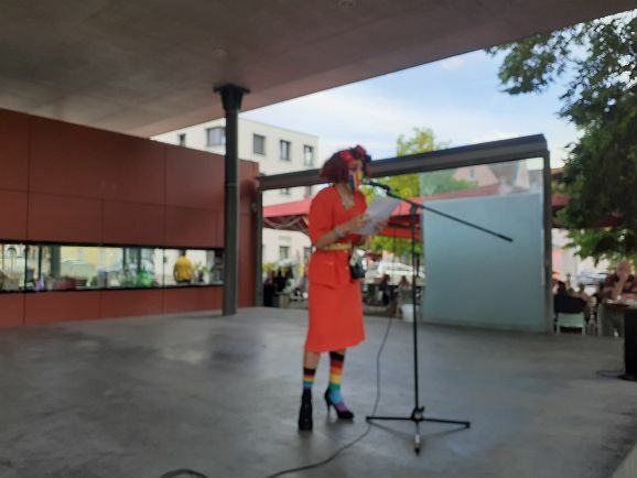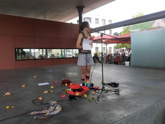 Einen sehr sympathischen Auftritt auf dieser großen Bühne hatte die Travestiekünstler*in Jonathan/Jonella, die erzählte, wie sie in der Schule als Schwuchtel gehänselt wurde. Ihr Auftritt endete im Zarah Leander-Stil mit Gesang.