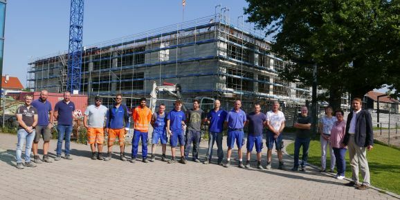 Bildunterschrift: Gruppenbild mit Baustelle – Bürgermeister Rainer Magenreuter, Diana Hanser und Heike Dietz vom städtischen Bauamt, Christopher Kraus (mse Architekten/Bauleitung) (von rechts) sowie Bauleiter Manuel Klein, Polier Sven Keller und Bauleiter Martin Kelz (Fa. Hebel/von links) mit einigen der Mitarbeiter. Im Bild fehlt Marc Schade (mse Architekten).