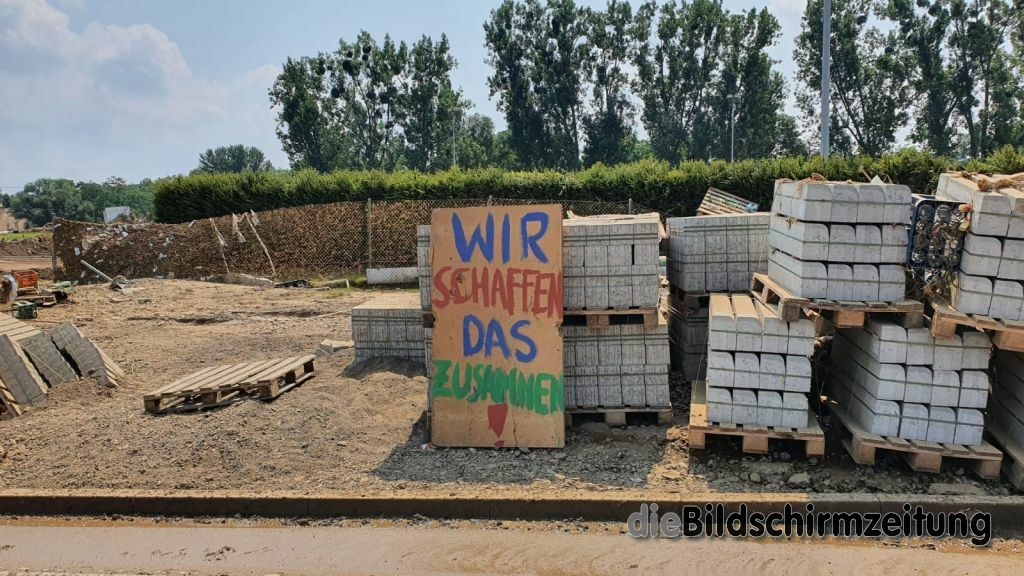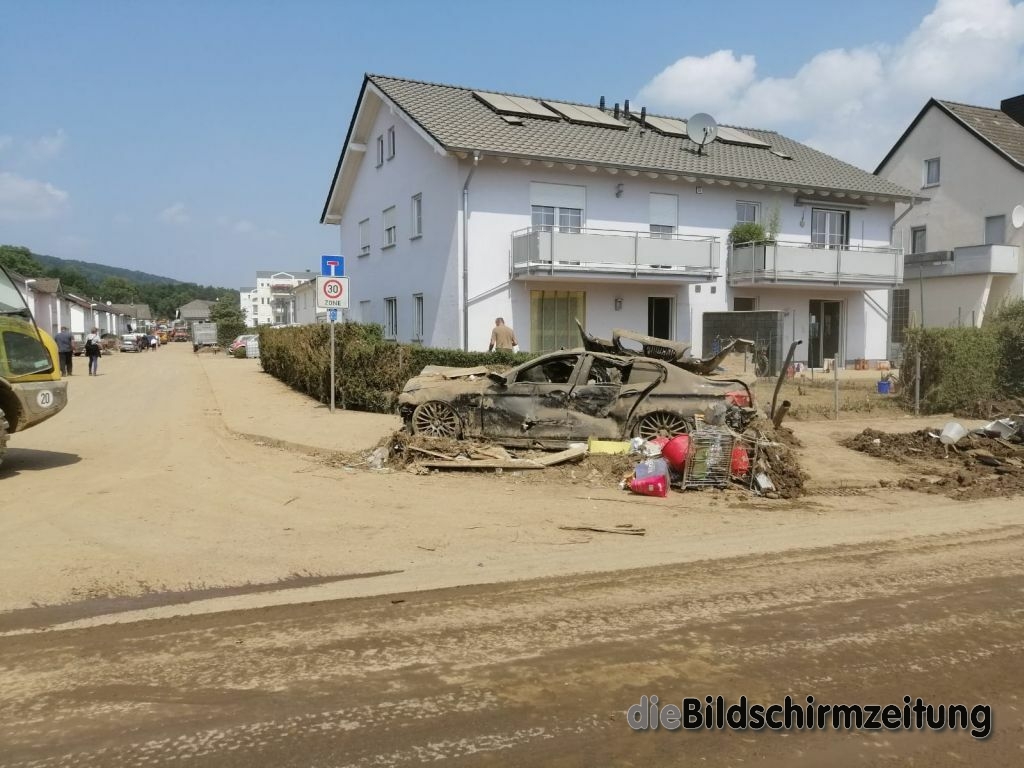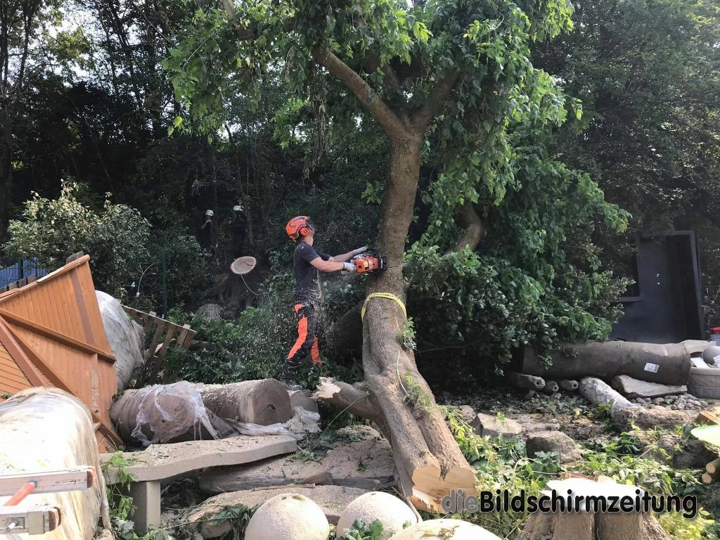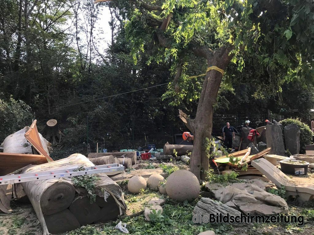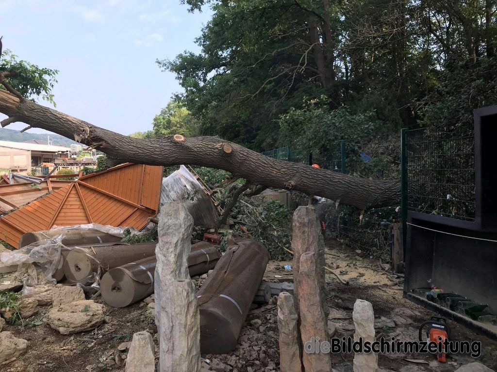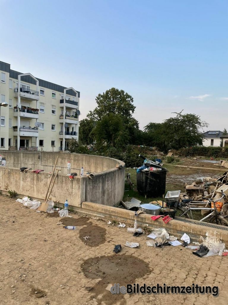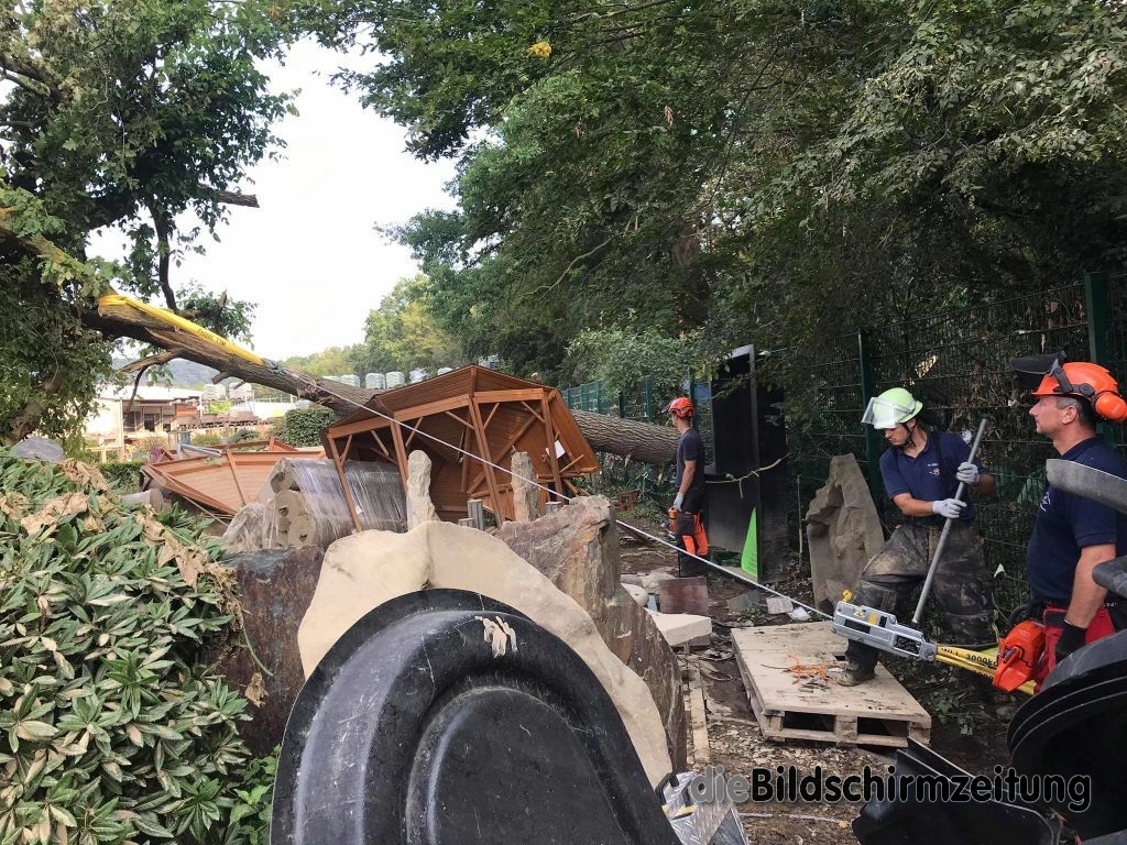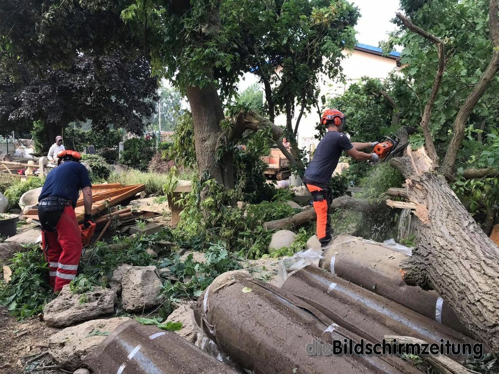 Es wurde weiter in der 8 Mehrfamilienhäuser umfassenden Wohnanlage persönliches Hab und Gut sowie Mobiliar ins Freie geschafft und Schlamm abgetragen. Bis spät in den Abend waren die Kräfte tätig und konnten schließlich melden, dass die Kellergeschosse komplett geräumt sind. Weiteres Personal des Hochwasserzugs war ebenfalls erneut auf einem großen Firmengelände tätig. Schwerpunkt an diesem Tag war die ca. 5000m² große Ausstellung auf dem Freigelände. Im Rahmen der Aufräumarbeiten musste akribisch mit technischem Gerät vorgegangen werden, da nahezu alles komplett zerstört wurde. In stundenlanger Arbeit wurden u.a. umgestürzte bzw. umzustürzen drohende Bäume zersägt, Gartenhütten und Ausstellungsgegenstände gesichert und entsprechend beiseite geräumt. Unterstützung kam durch die Feuerwehr Erolzheim, die dem Katastrophenschutzzug des Landkreises Biberach angehört.