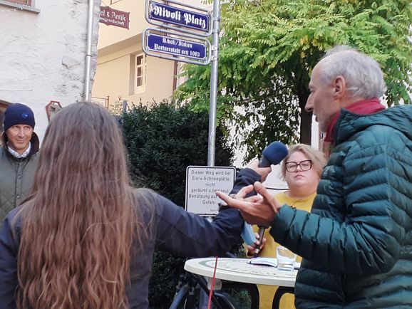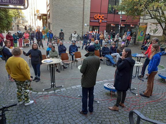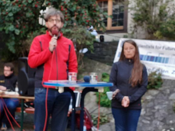 Seine Umweltbeauftragte ist viel mit dem Rad unterwegs und setzt sich ein für ein Radverkehrskonzept, das letzte Woche auf Verbandsebene beschlossen wurde und „großes Potenzial habe“. 2016 noch Einzelkämpferin hat ihr Amt jetzt 14 Mitstreiter:innen. Samnuel Bosch, der Aktivist auf den Bäumen in Ravensburg und dem Altdorfer Wald, sieht sich als Vorreiter für eine „klimaneutrale und klimafreundliche Stadt“. Ihm gehen alle vorgenannten Schritte noch viel zu langsam, eine Feststellung, die viel Beifall erhielt. Während Buchmann-Mayer ihre Schwerpunkte bei Klimagerechtigkeit und Tranparenz sieht, möchte der Wissenschaftler Frisch Fakten in die Diskussion streuen. „Ziemlich am Anfang wartet das Klimakonzept noch auf seine Umsetzung, so Rapp, und konkret in Ravensburg sind es eine andere Mobilität, mehr Investitionen in Fußgänger- und Radverkehr, sowie ÖPNV, statt wie bisher zu 90 % den individuellen Autoverkehr zu fördern.