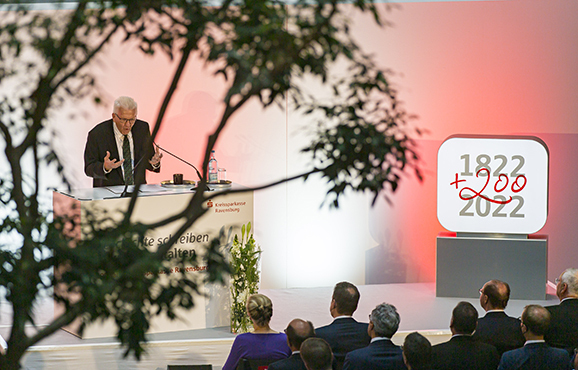 In Bayern hätte man beim Einzug des Ministerpräsidenten wohl den Defiliermarsch geblasen. In Ravensburg liebt man es dezent. Das passt zu dem schlanken, in Ehren ergrauten hohen Gast. Und zur zurückhaltend-altehrwürdigen Gastgeberin, der Kreissparkasse, die ihr 200-jähriges Bestehen feiert.