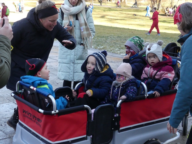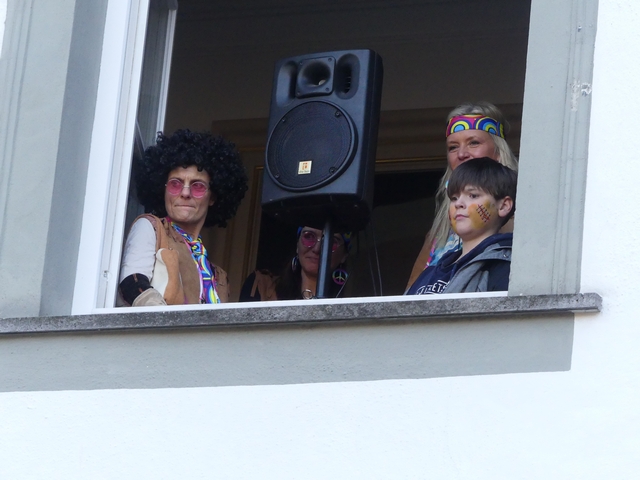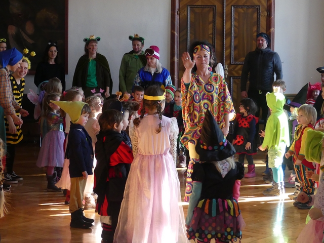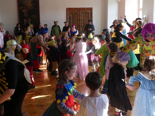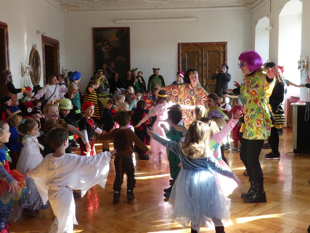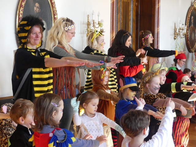 Während die Hästräger der Hudelmale und zahlreiche Musiker noch in Kissleggs Schulen die Schüler befreiten, feierten die Kleinsten vom Kindergarten St. Hedwig schon eine Mega-Faschingssause im Cesarsaal des Schlosses. Prinzessinnen, Bienen, Hippies und Einhörner tanzten auf die Musik der alten Fasnetsgassenhauer und hatten sichtlich großen Spaß daran.