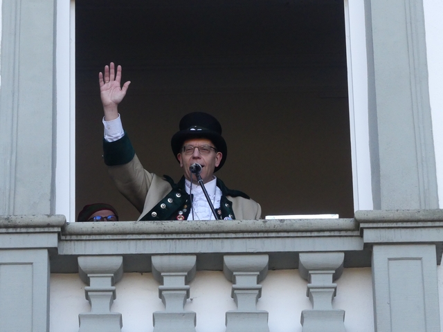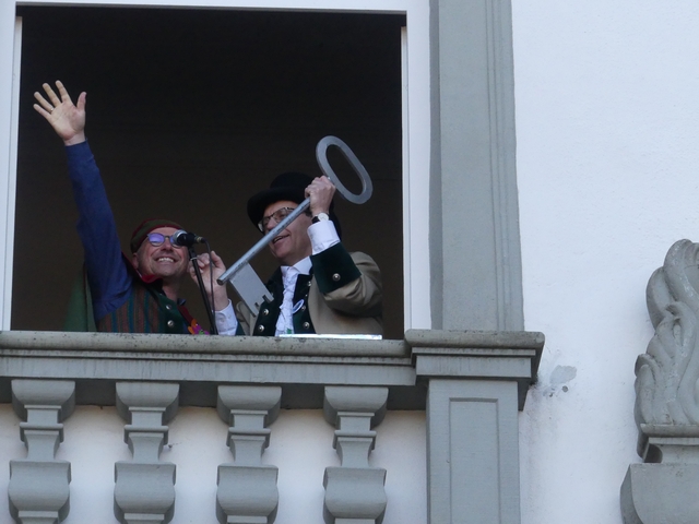 Nach musikalischer Einstimmung schritt Zunftmeister Hajö Schuwerk zur Tat und verkündete der Narrenschar, dass der „Straßendieter“ mit Hang zu Bauprojekten nun mal ein paar Tage Pause machen darf. Ganz so einfach wollte sich dieser aber nicht geschlagen geben, er nutzte die Gelegenheit sich bei Luisa und Paul, die während der närrischen Tage, im Kisslegger "Löwen" Gäste bewirten, zu bedanken. Es half ihm jedoch alles nichts, die Mäschkerle im Schlosshof waren einfach in der Überzahl und das „Schnarragagges heidenei“ zu laut und unüberhörbar; der Schultes beugte sich und übergab seine Herrschaft und den Rathausschlüssel an den Vorsitzenden der Hudelmale.