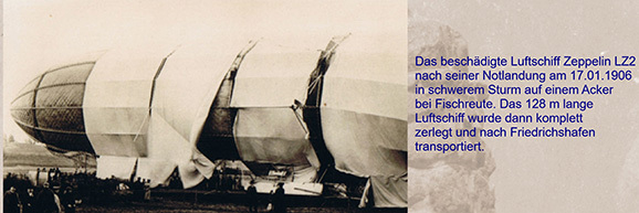 Damals startete das zweite Luftschiff LZ2 des Grafen Zeppelin zu seinem zweiten Testflug über den Bodensee. Starke Südwestwinde ergriffen das Luftschiff und steuerten es in Richtung Kisslegg. Die Motoren und die Steuerung versagten. Als Landeplatz wurde ein freies Feld anvisiert. Der Zeppelin konnte mit seinem Anker in der festgefrorenen Erde nicht hängenbleiben, so verfing sich das Heck an einem freistehenden Baum. Mit einem harten Ruck endete der Flug. Die Besatzung blieb unversehrt. Zuerst dachte man, das 128 m lange Luftschiff auf dem Landweg wieder zurück nach Friedrichshafen zu bringen. Doch das ging nicht und so wurde es an Ort und Stelle demontiert, um es in Einzelteilen in der Halle wieder zusammenzubauen. Das große Luftschiff sorgte für Aufregung bei den Einheimischen. So besuchten viele diese ungeplante Landestelle und so manches übriggebliebene Alustück oder Stoffteil des Zeppelins wurde als Erinnerungsstück ins eigene Heim überführt. Graf Zeppelin musste den zu demontierenden Zeppelin mit Hilfe von Soldaten schützen.