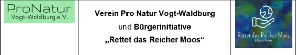 Aus der Bürgerinitiative „Rettet das Reicher Moos“ hat sich am 9.5.2023 der Verein Pro Natur Vogt-Waldburg mit Sitz im Habichtweg 2 in 88289 Waldburg, gegründet. Hubert Wegele als Initiator der Bürgerinitiative begrüßte 21 Teilnehmende. Zweck des Vereins ist die Förderung des Naturerhalts und aller Maßnahmen, die im weitesten Sinne dazu hilfreich sind. Der Verein ist für alle offen, die zum Grundgesetz der BRD stehen und keine Menschen ausgrenzen. Er arbeitet aktuell ohne Mitgliedsbeiträge, solidarisch auf Spendenbasis. Der Verein unterstützt die Ziele der bestehenden Bürgerinitiative vollumfänglich und freut sich über am Naturerhalt interessierte Menschen als neue Mitglieder:innen!