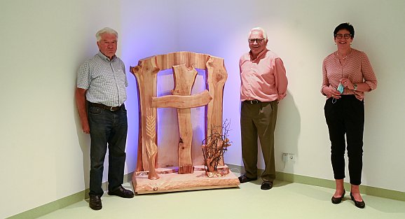 Ravensburg (phe) - Die Wolpertswender Künstler Peter Hecht und Josef Wöllhaf haben dem St. Elisabethen-Klinikum in Ravensburg eine Holzskulptur gespendet. Sie findet ihren Platz im Aufbahrungsraum. Peter Hecht erklärt zu dem Werk: „Die Skulptur besteht aus drei Elementen, der Dornbusch ist ein Zeichen für Leiden, das Kreuz ist ein Zeichen für Sterben und die Ähre ist ein Zeichen der Wiedergeburt.“