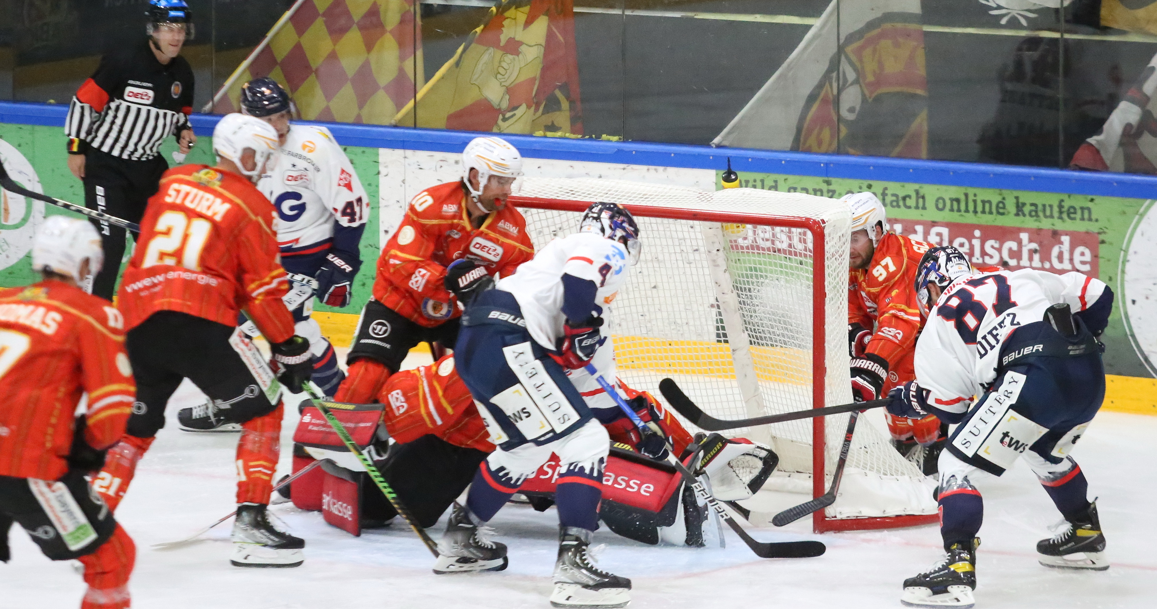 Die Stimmung beim Derby in Kaufbeuren war prächtig und beide Mannschaften zogen von Beginn an ein schnelles Spiel auf. Der Puck glitt zwar flott durch die neutrale Zone, in ihren Verteidigungsdritteln behielten beide Teams aber die Kontrolle und so waren wirklich hochkarätige Einschussmöglichkeiten zunächst Mangelware.