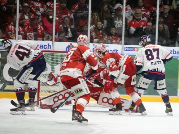 Jetzt hatte die Partie eine völlig neue Phase. Die Towerstars verstärkten die Defensivarbeit an der eigenen blauen Linie und lauerten auf Konter. In der 51. Minute konnte Jordan Hickmott auf halbrechter Position dennoch zum Schuss kommen und die Scheibe zappelte zum 3:3 Ausgleich im Ravensburger Netz. Alles war wieder auf null gestellt und beide Teams klappten für die Schlussphase sprichwörtlich das Visier nach oben.