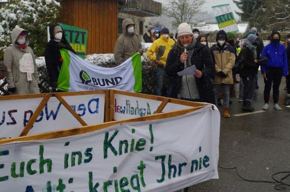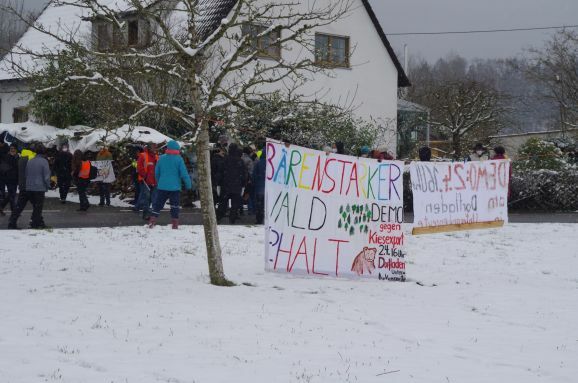 Kies habe Vorfahrt vor Wald, Klimaschutz und Mensch. Sie betont, „trotz des schlechten Wetters sind so viele Bürgerinnen gekommen, um sich gegen den Kiesabbau zu stellen. Es sind nicht nur ein paar junge Leute die dort oben im Wald gegen den Kiesabbau kämpfen, sondern auch wir Anwohner*innen sind klar gegen eine Fortführung dieser Umweltzerstörung. Seit Jahrzehnten regt sich der Widerstand, jetzt gehen wir endlich geschlossen auf die Straße, denn es geht um unseren Wald und vielmehr noch um die Zukunft unserer Kinder."