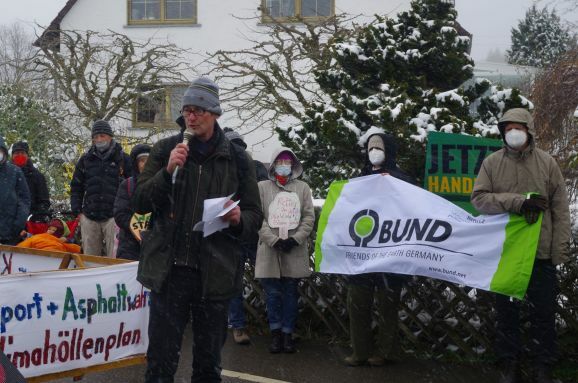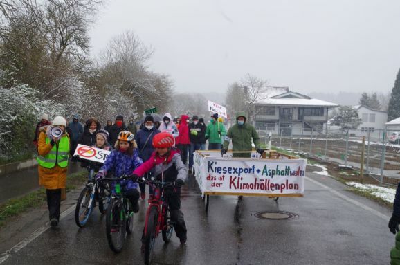 Sie forderte einen zukunftsfähigen Regionalplan, für den schon 15 000 bis 20 000 Stimmen gesammelt wurden. Danach setzte sich der Demonstrationszug durch das Wohngebiet Richtung Oberankenreute in Bewegung. Am Wirtsbühl, der am nächsten an der Kiesgrube gelegenen Straße in Oberankenreute, erinnerte die die Anwohnerin Ulla Köberle-Lang an den 23. Februar dieses Jahres, wo dieses Gebiet großräumig von der Polizei abgesperrt wurde, um vier Baumbesetzerinnen von den Bäumen zu räumen. Kinder kamen nicht zur Schule, aber Kieslaster durften fahren.