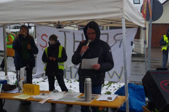 Zu Beginn gab es am Gemeinschaftshaus einen Rede zum Regionalplan von Barbara Herzig und ein Gedicht von Rechtsanwalt Klaus Schulz zur Klimagerechtigkeit. Herzig betonte, dass der Regionalplan eine völlig überdimensionierten Wohn- und Straßenbau vorsehe, statt Ressourcen zu schonen und unter Schutz zu stellen.