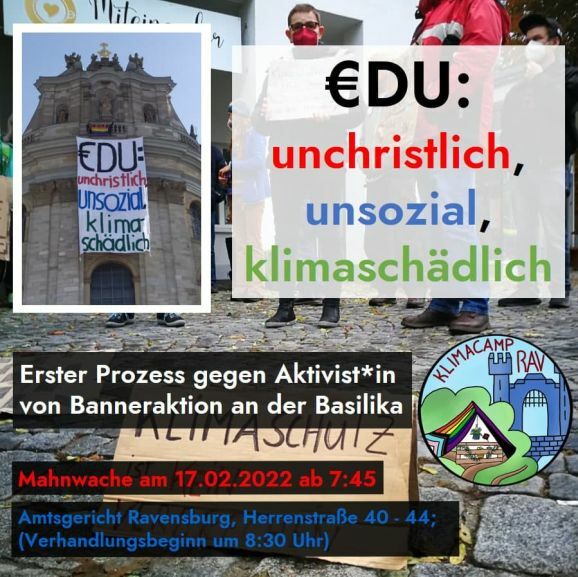Weingarten - Am 25.09.2021, einen Tag vor der Bundestagswahl, kletterten die drei Aktivistinnen Charlie Kiehne (19), Martin Lang (55) und Samuel Bosch (19) auf die Basilika in Weingarten. Sie entrollten ein CDU-kritisches Banner mit der Aufschrift "€DU: unchristlich, unsozial, klimaschädlich" um so kurz vor der Bundestagswahl "ein Zeichen zu setzen".