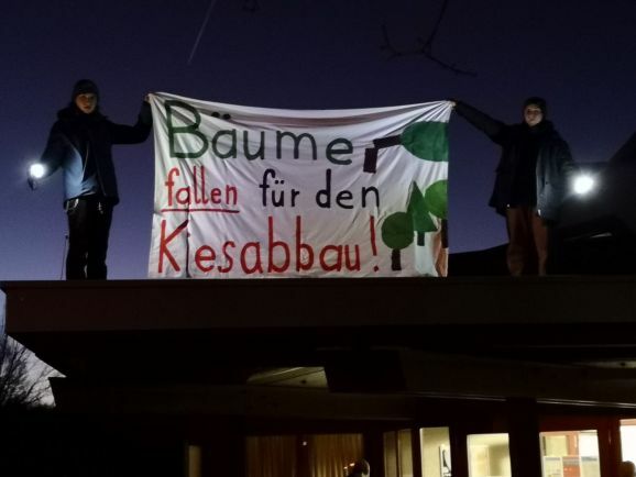 Wetzisreute - Am 08.02.2022 gegen 18 Uhr kletterten zwei Aktivist*innen auf das Vordach der Turn- und Festhalle in Wetzisreute.
