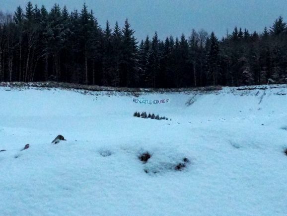 Oberankenreute - In der Nacht vom Mittwoch (19.01.) auf den Donnerstag (20.01.) installierten Anwohnerinnen zusammen mit Aktivistinnen aus der Altdorfer-Wald-Besetzung eine Kunstaktion in und über der Kiesgrube bei Oberankenreute.