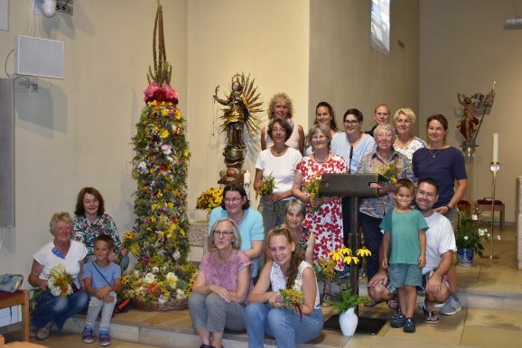 Das herrlich duftende, bunte Kräuterkunstwerk bekam einen Platz in der Kapelle neben der Muttergottes-Statue und der köstlich-herbe Duft verbreitete sich im ganzen Raum. Lavendel, Rosmarin, Salbei, Thymian, Johanniskraut, Kamille, Baldrian, Schafgarbe, Ringelblume, Echinacea, Malve, Melisse sind darunter, um nur einige „Zutaten“ zu nennen, insgesamt sind mehr als 50 Pflanzen verarbeitet.