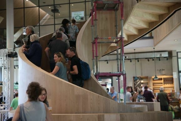Über gesunde und vollwertige Ernährung können Familien auf verständliche Art allerlei lernen. Auf Statinen wie Bio-Anbau, Fairem Handel geht es zum Thema wie Lebensmittelverschwendung. Die hochgelegenen Räume sind für regelmäßige Veranstaltungen wie Yoga-Kurse, Koch-Events oder Vorträge vorgesehen. Ganz unten ist eine Bar und ein Weinkeller. Die können auch für besondere Feste angemietet werden.