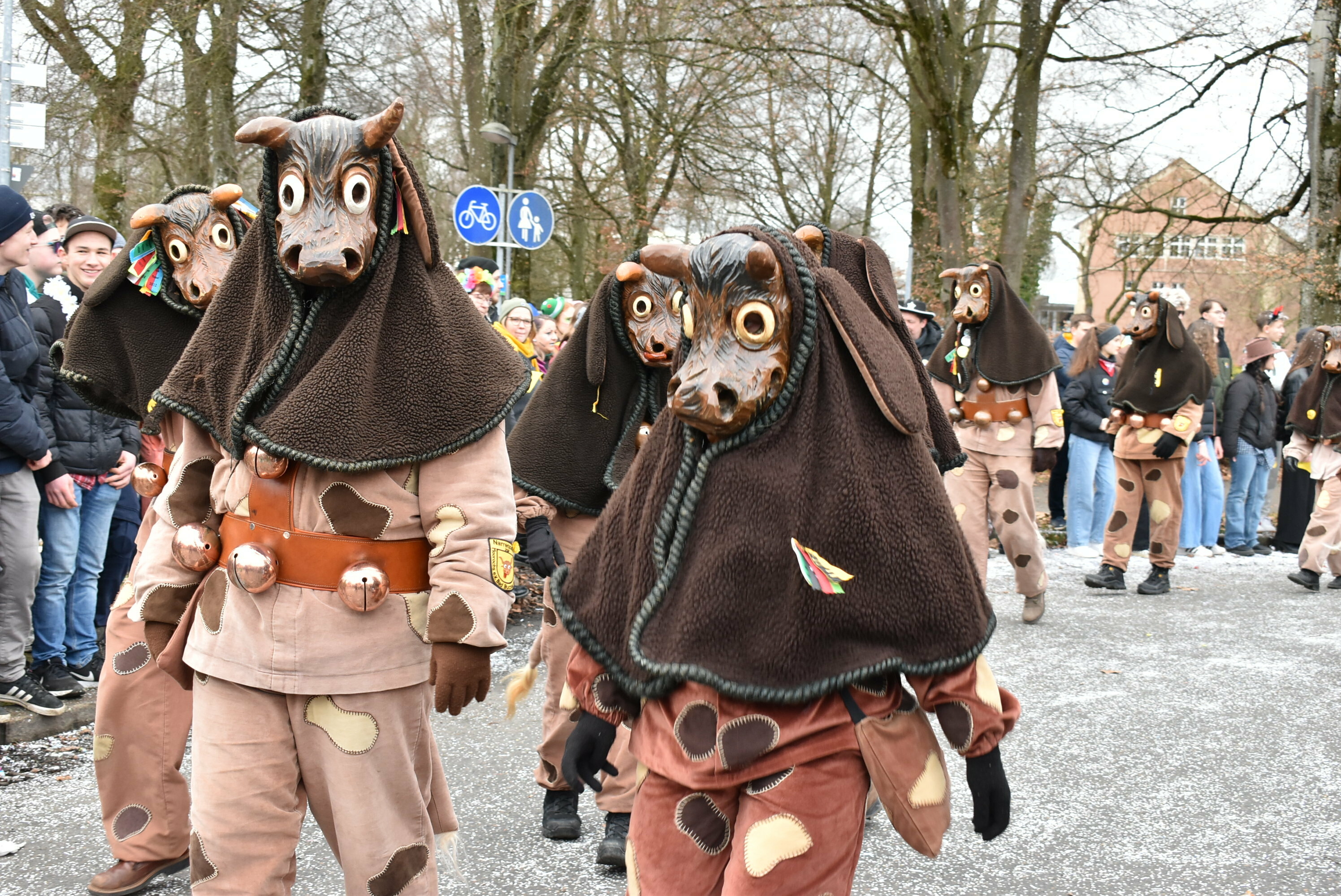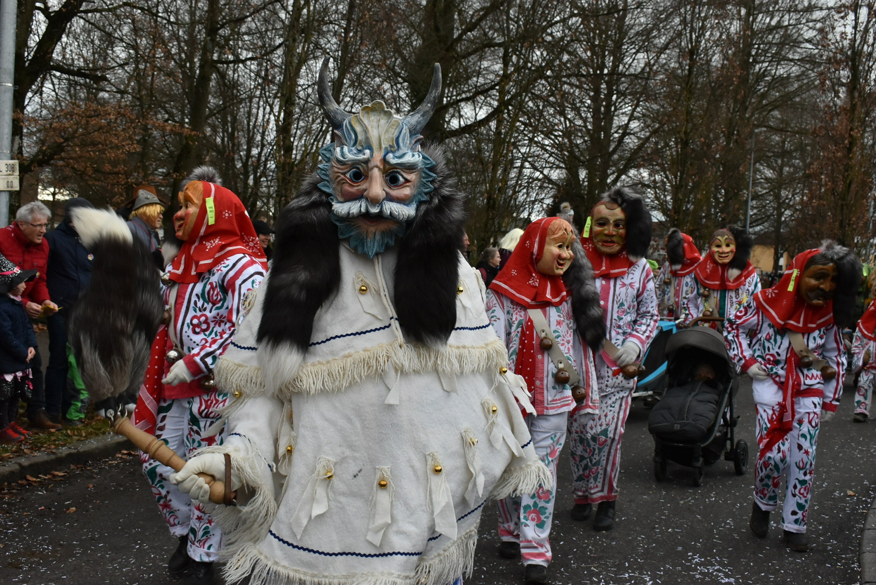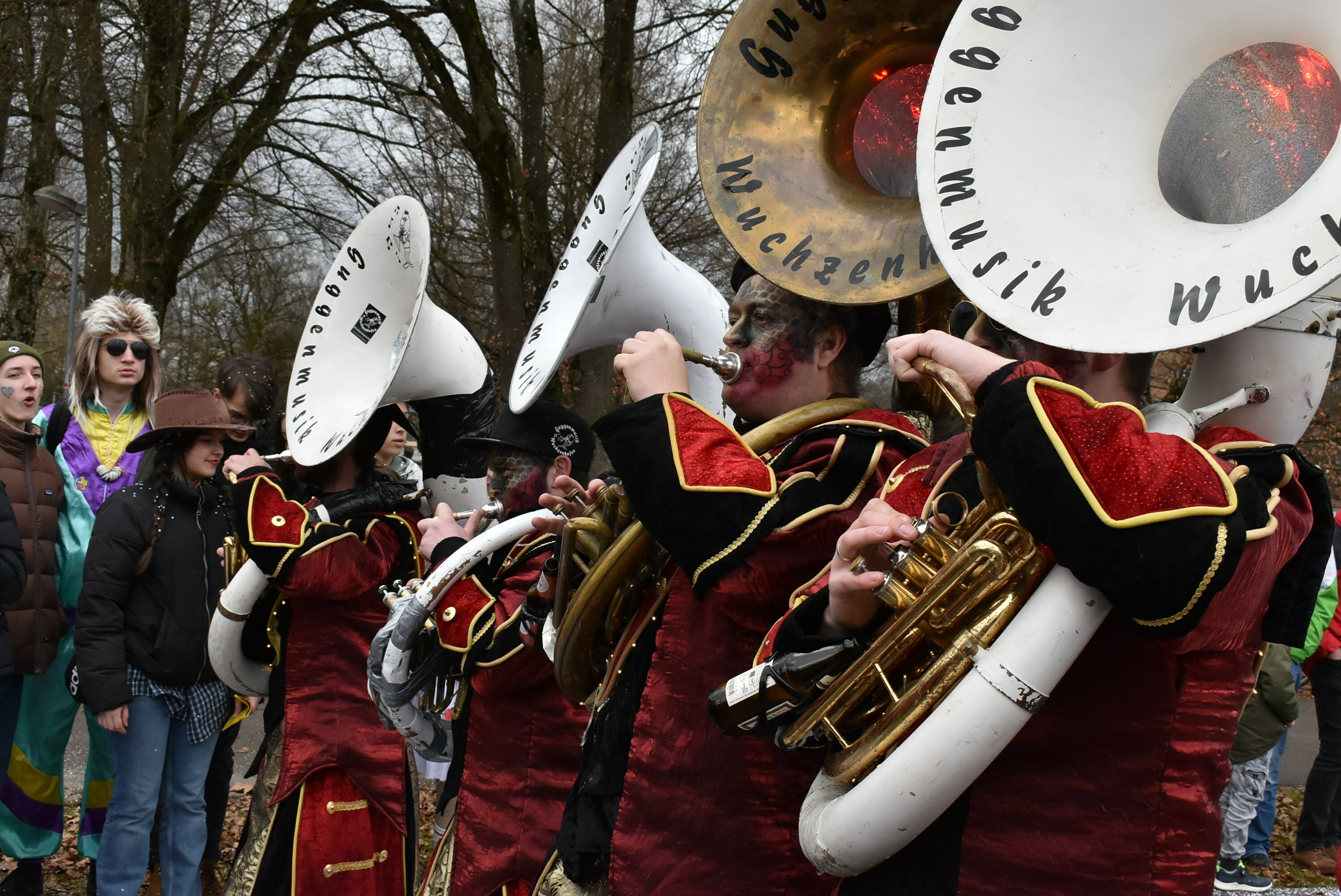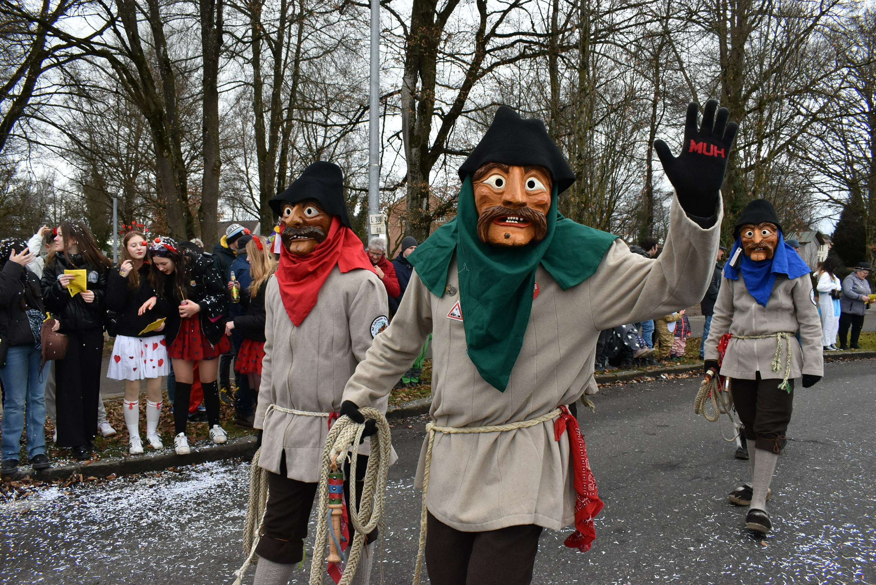 Aus Nah und Fern waren die Narren- und Maskengruppen von der örtlichen Narrenzunft (NZ) Nibelgau eingeladen worden. Allen voran ging die Stadtkapelle Leutkirch im närrischen Mexikaner-Gewand. Es folgte die NZ Nibelgau mit dem imposanten Katzenwagen, von dem das Prinzenpaar und einige vom Präsidium herunter grüßen. Als Nachbarzunft konnten die Zuschauer die NZ Lachende Kuh aus Isny willkommen heißen: Hey-Muh.