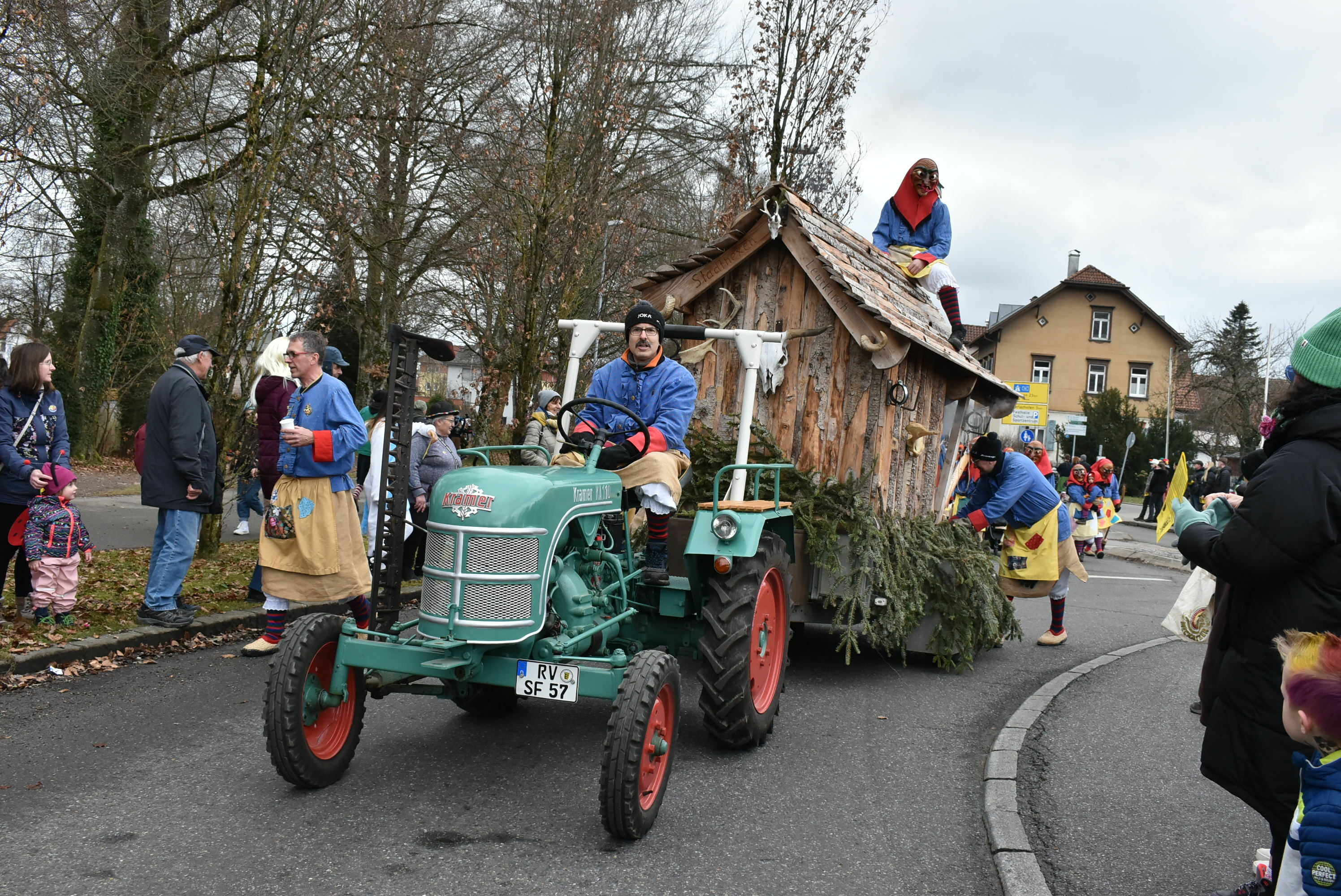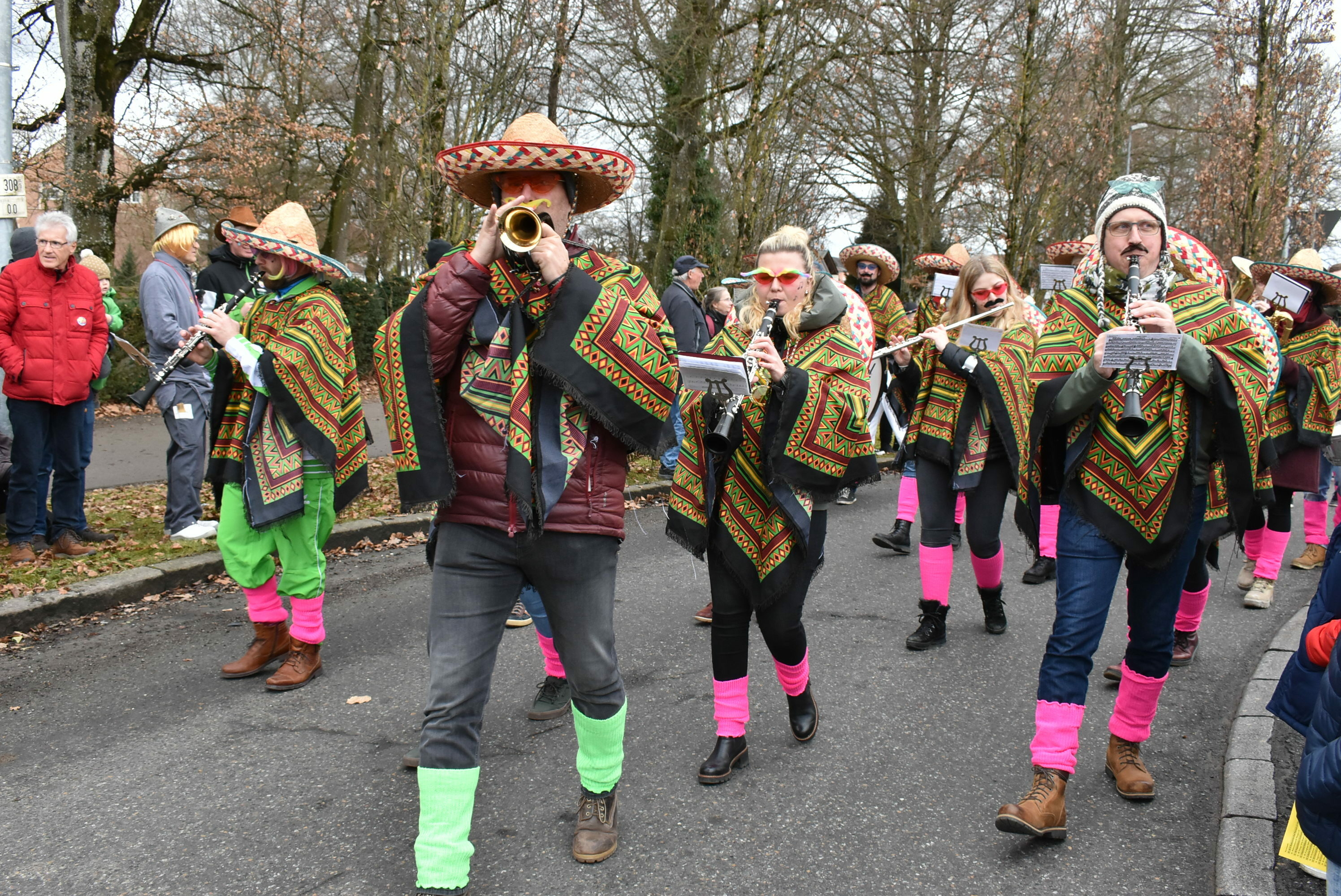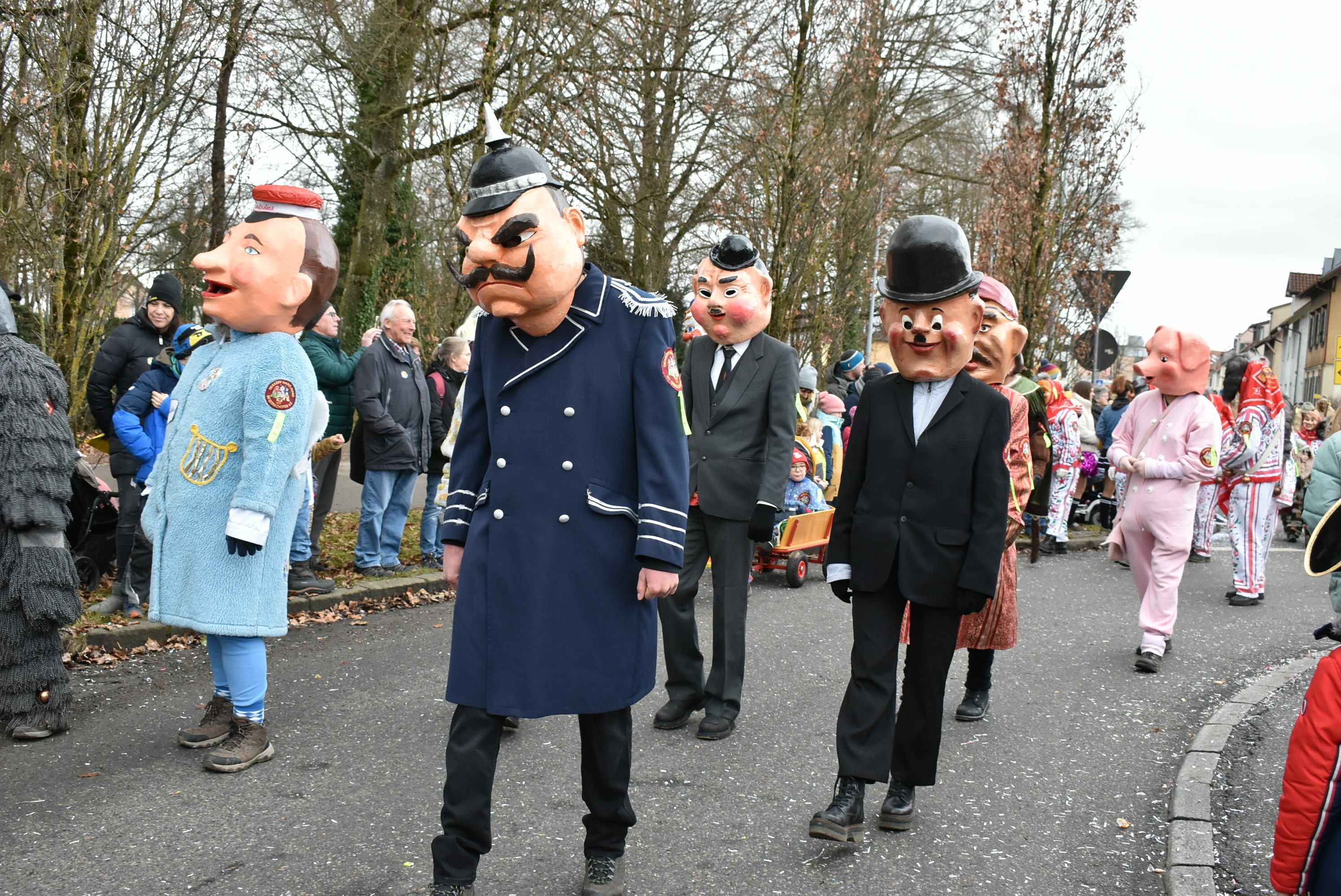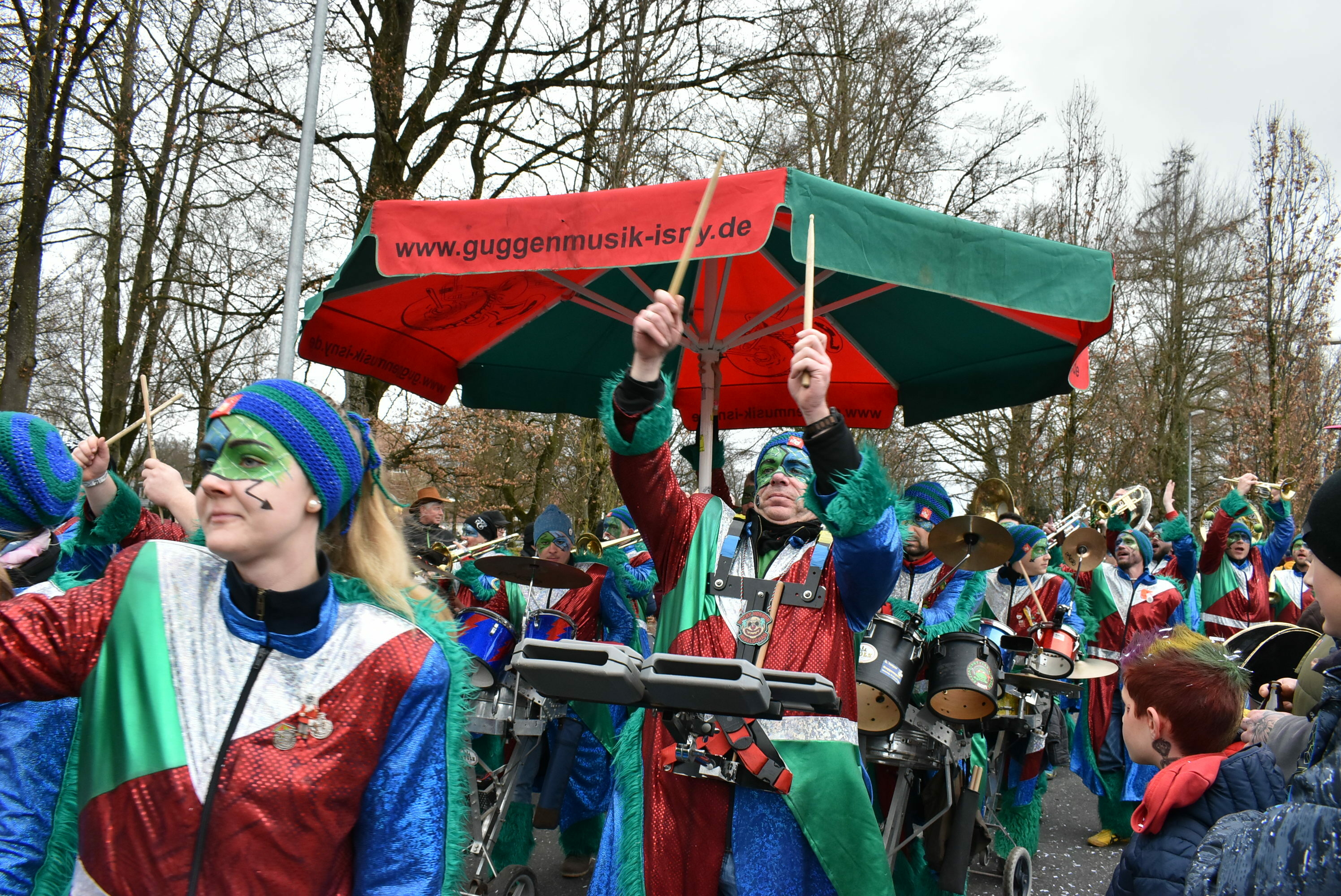 Aus Nah und Fern waren die Narren- und Maskengruppen von der örtlichen Narrenzunft (NZ) Nibelgau eingeladen worden. Allen voran ging die Stadtkapelle Leutkirch im närrischen Mexikaner-Gewand. Es folgte die NZ Nibelgau mit dem imposanten Katzenwagen, von dem das Prinzenpaar und einige vom Präsidium herunter grüßen. Als Nachbarzunft konnten die Zuschauer die NZ Lachende Kuh aus Isny willkommen heißen: Hey-Muh.