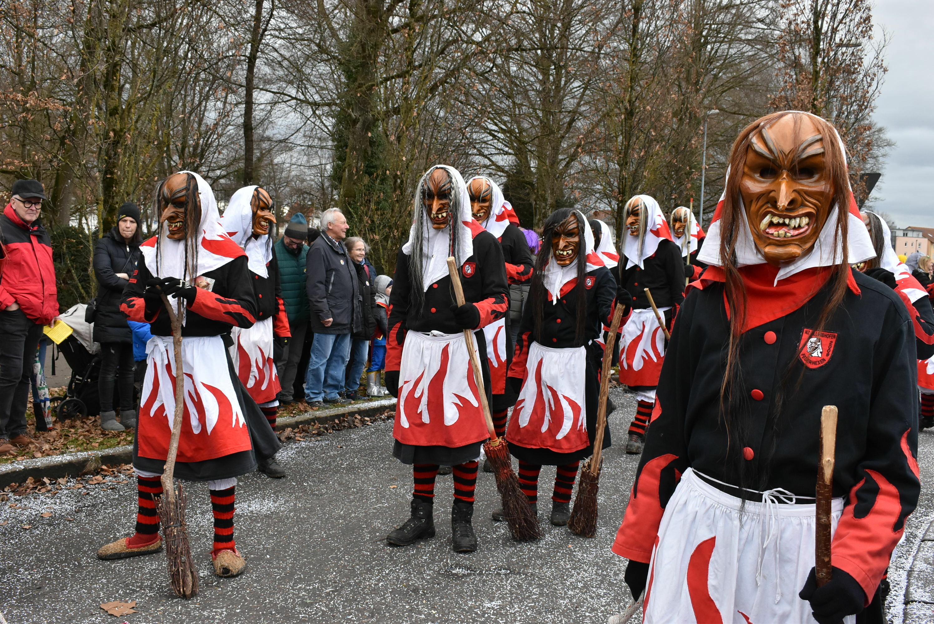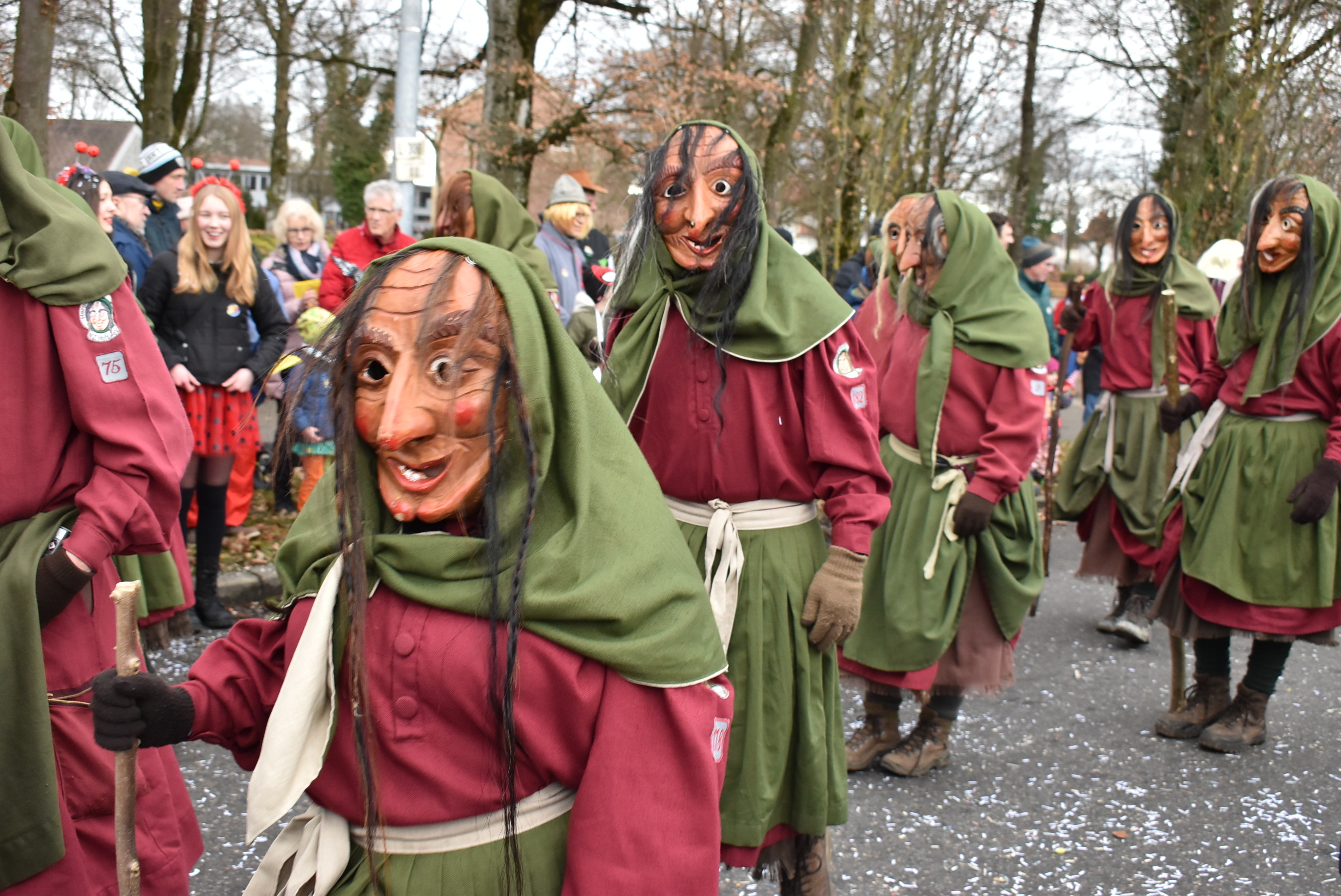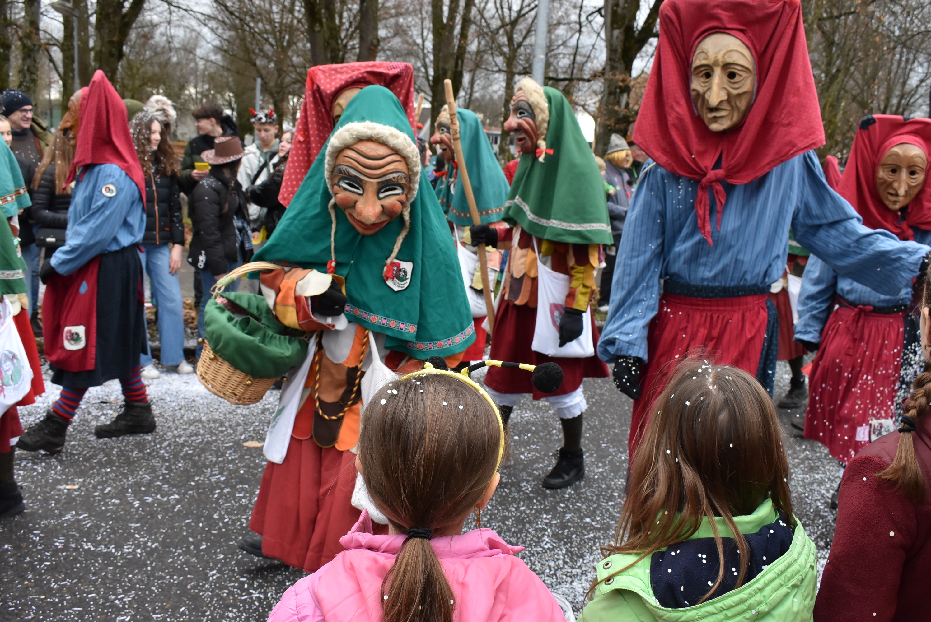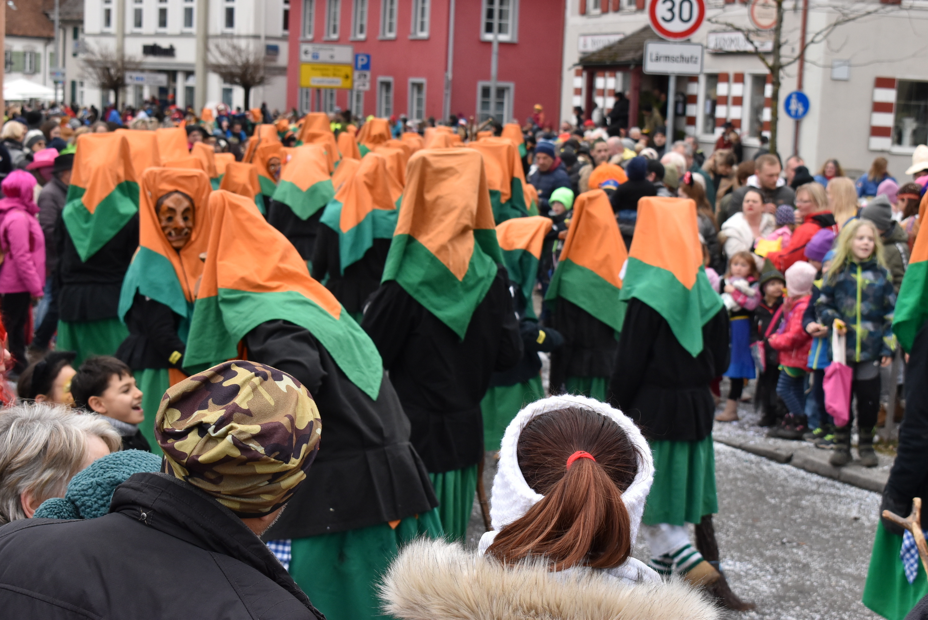 Schön war es, dass auch wieder die Bayern dabei waren: Kempten mit drei Gruppen, die Memminger Stadtbachhexen, Gruppen aus Buxheim und auch aus Buchenberg war eine Hexengruppe mit im Narrenwurm, der an mehreren Stellen von närrischen Fachleuten kommentiert wurde.