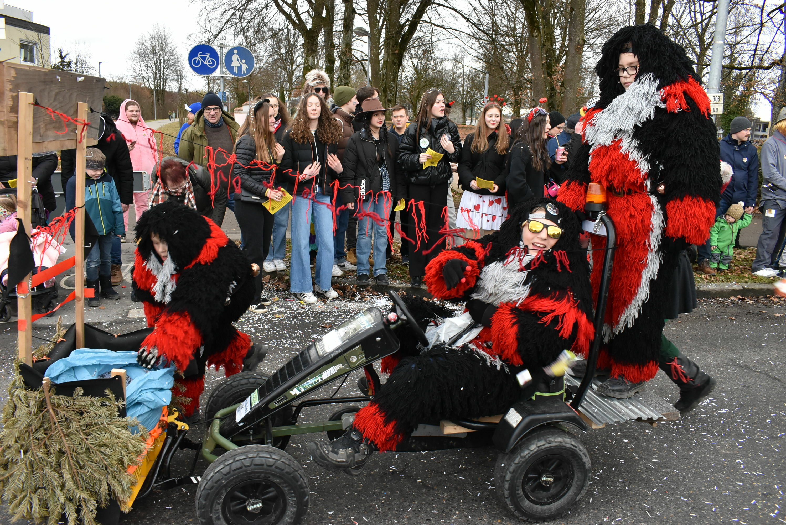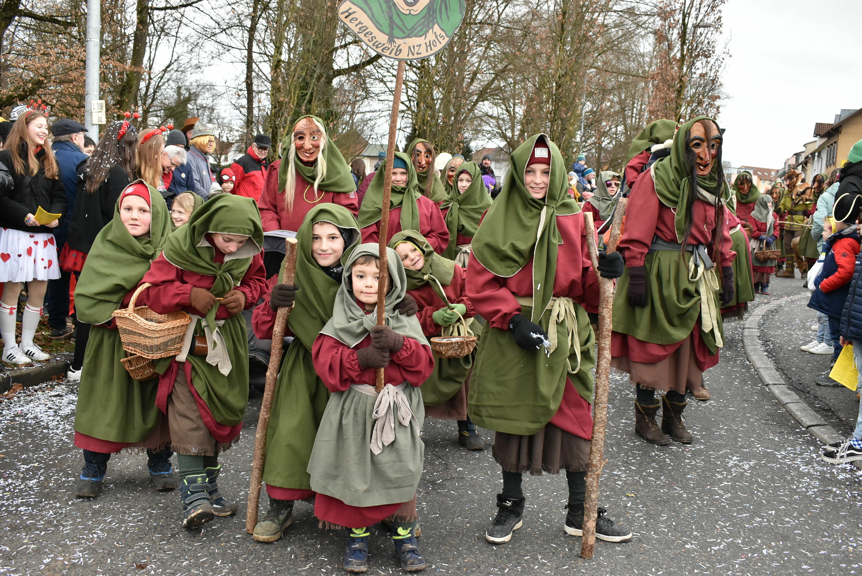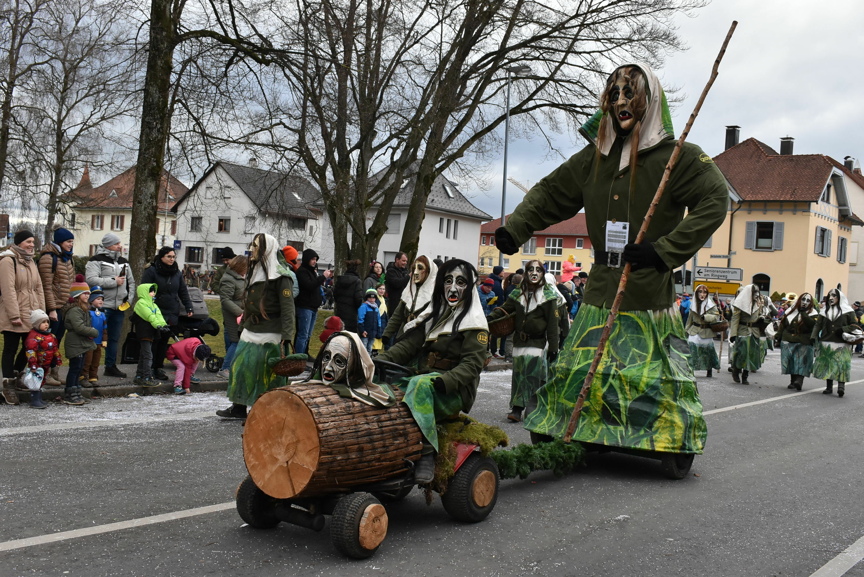 Viele Familien mit Kindern sowie Jugendliche waren begeistert am Straßenrand voll dabei und so mancher Konfetti-Regen ergoss sich über die Köpfe, manch ein Mädel wurde kurz mal unfreiwillig mitgenommen, alles ganz harmlos und friedlich. Auch bei den Narrengruppen sah man außergewöhnlich viele mit Kinderwagen und darin schon der Narrensamen in kleinen Kostümen – ohne die Holzmasken. Der graue Himmel tat der tollen Fasnetsstimmung in Leutkirch keinen Abbruch. Es hielt – kein Regen, immerhin.