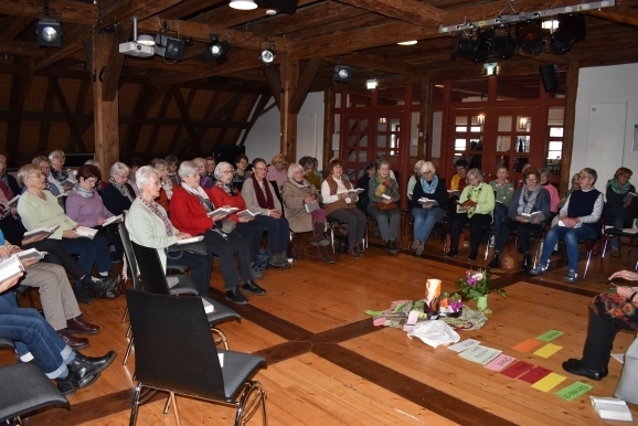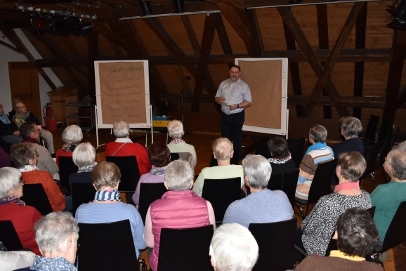 Der Referent fragt auch anders herum: „Was erwartet das Leben von mir?“ Ein „Sich-aufopfern für andere“ – macht das Sinn? Was erfüllt mich wirklich, was ist nur Schein? Sicher macht die Familie für die meisten den Sinn des Lebens aus. Kinder, Enkel – das ist gefühlte Zukunft, dafür lohnt es sich zu leben, denken viele, doch das zeichnet den Christen nicht aus. Was für mich gilt, muss nicht für andere gelten und so ließ Stephan Wiltsche die anwesenden Frauen, sicherlich viele Mütter, Großmütter, Schwestern, Tanten darunter, auf Zettel notieren, was für jede persönlich der Sinn des Lebens ausmacht, was erfüllt einen wirklich.