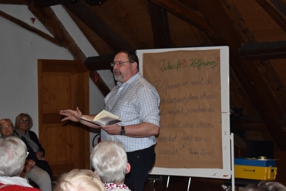 „Wer ein WARUM zum (Sinn) Leben hat, erträgt auch jedes WIE“, mit diesem Zitat von Friedrich Nietzsche durften die Anwesenden ins Thema nach dem Sinn des Lebens eintauchen, der die Zukunft mit Hoffnung verbinden will. Sicher ist: Sterben müssen wir alle. Wo also ist der Sinn des Lebens, gleichbedeutet für Christen mit: „Wo ist Gott? Was steckt hinter dem Plan oder wofür lohnt es sich zu leben.“