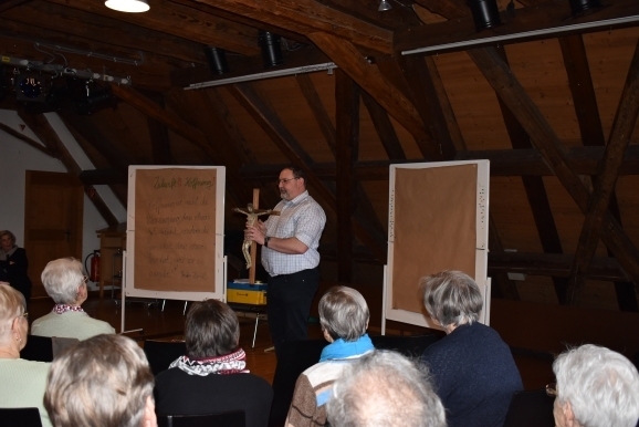 Die christliche Komponente komme nun dazu und gebe Antworten auf die Fragen nach Zukunft, Sinn und Leben, denn auch Krankheit und Leiden könne ein Sinn des Lebens sein. Die Hoffnung liege im Kreuz. „Jesus ist für uns Menschen gestorben, hat sein Leiden für die Errettung der Menschen geopfert. Im Kreuz ist Heil und Vollendung, die Erfüllung aller Hoffnung“, so der Dekanatsreferent und zeigte ein großes Holzkreuz. Pause und Besinnung.