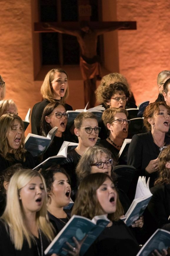 Die Vorsitzende zeigte ihre selber erstellte Power-Point-Präsentation und hielt einen kurzweilig-spannenden Rückblick auf zehn Konzert- und Vereinsjahre. Große Konzertveranstaltungen mit eigenen und auswärtigen Ensembles, das Konzert zum Kirchenjubiläum im Jahr 2019, als das sehr beeindruckende „The Armed Man“ aufgeführt wurde. Etliche aufwendige Advents- und Silvesterkonzerte (seit 2012) waren und bleiben die bisherigen Highlights, die bei der Bevölkerung sehr gut ankommen. Die Idee der farbigen Beleuchtung innerhalb der Kirche stammt ebenfalls vom FV und teilweise wurden die Strahler selber finanziert, wie zum Beispiel die Lichtinstallation zur Friedensmesse von Karl Jenkins in 2019 in bunten Farben.