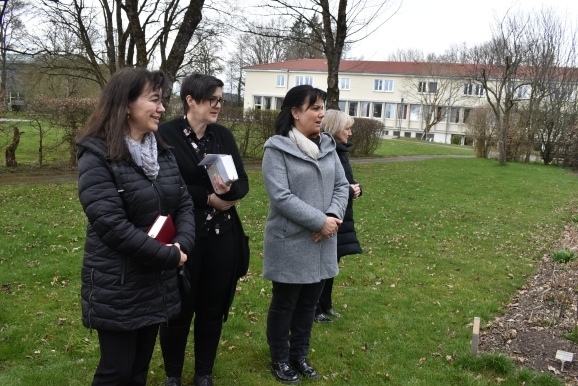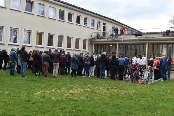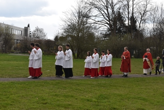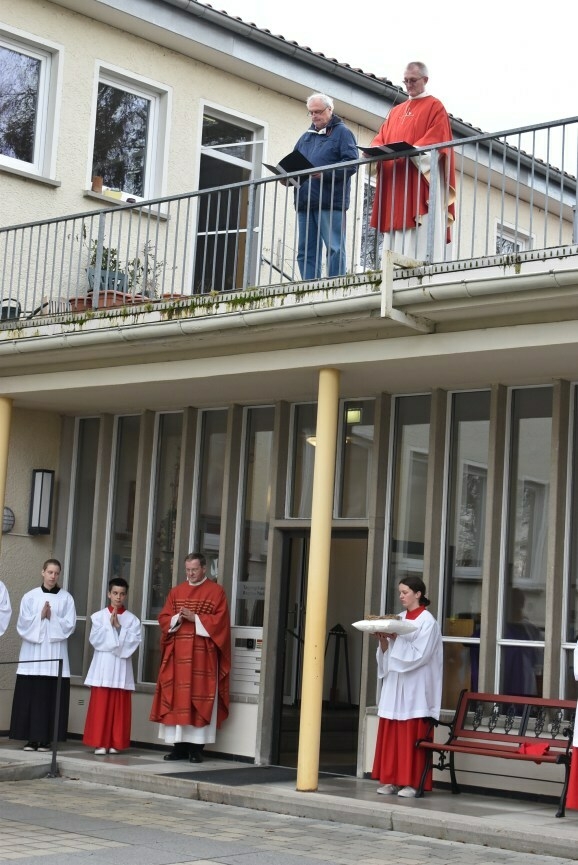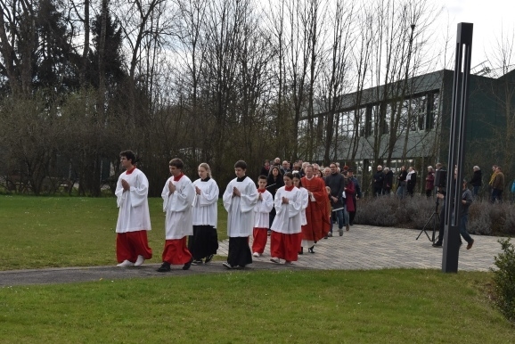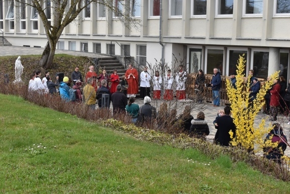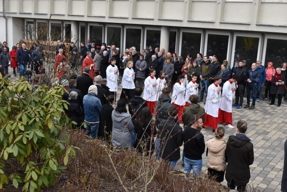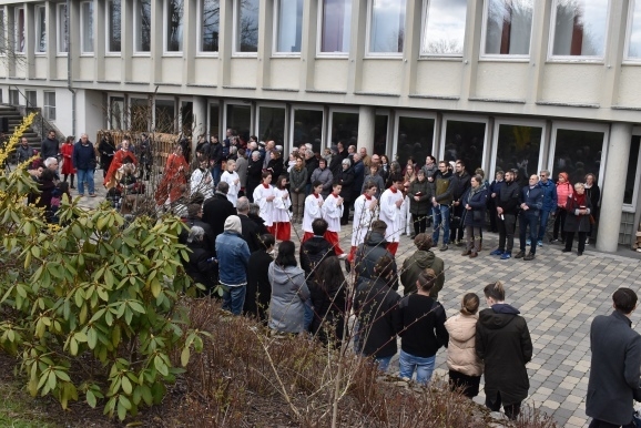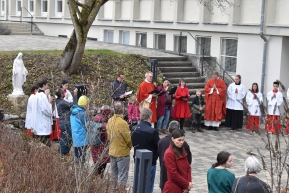 Vom Saal aus ging eine lange Prozession, voran die Seelsorger Pater Gabriel Maiwald und Pater Hubertus als geistlicher Rektor des Hauses und viele Ministranten, hinaus in den großen Garten. Hier fand „die Festnahme von Jesus statt“, und weiter ging es zur Terrassenmulde, wo die Geißelung und die Verhöhnung des „angeblichen Sohn Gottes“ gesprochen wurde. Begleitet wurde die Prozession von einem Gesangs-Trio mit den Passionsliedern wie „Bleibet bei mir – wachet mit mir“.